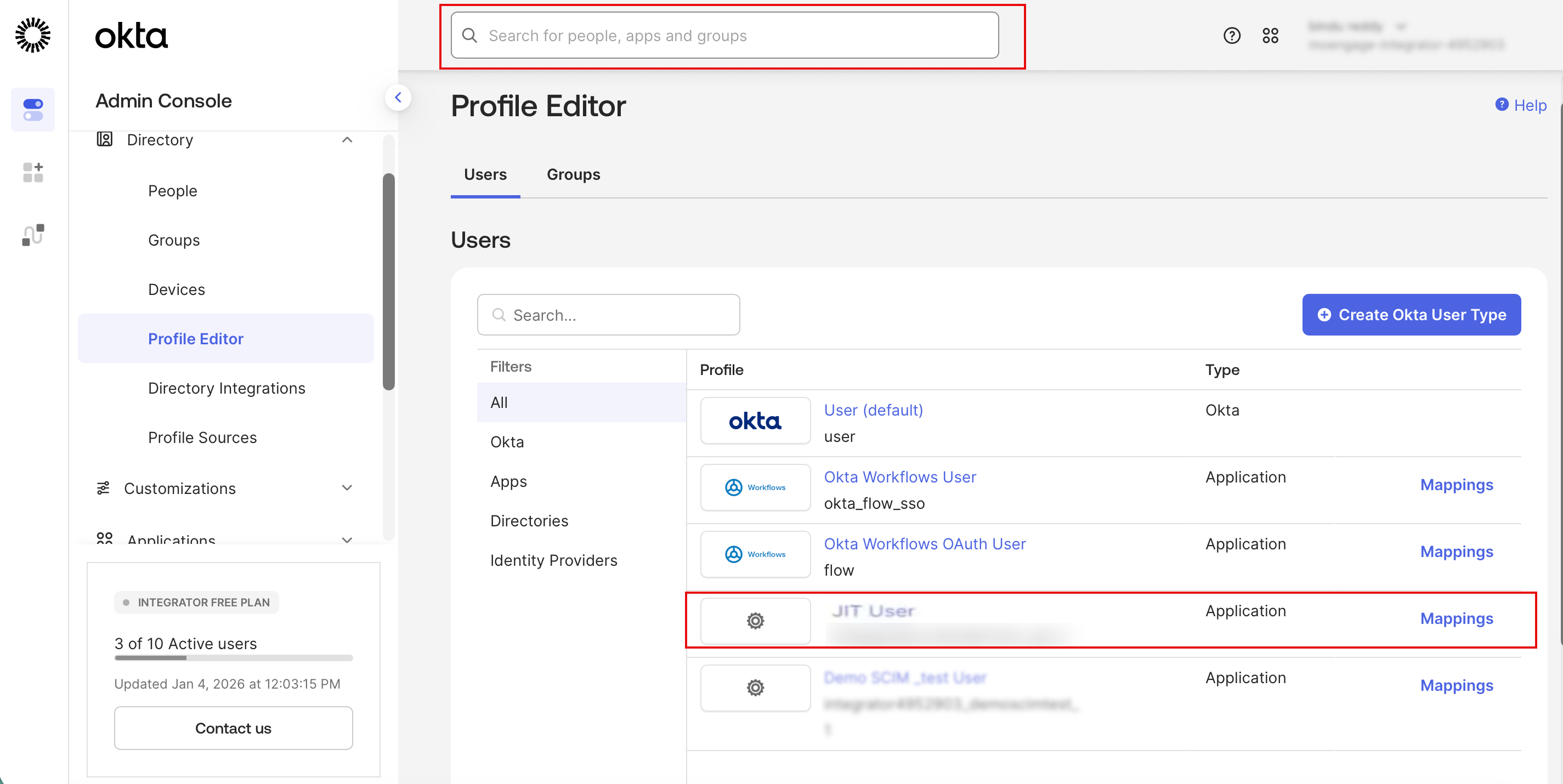 - On the Profile Editor page, select the MoEngage SSO application you created or use the Search for people, apps, and groups box to find it.