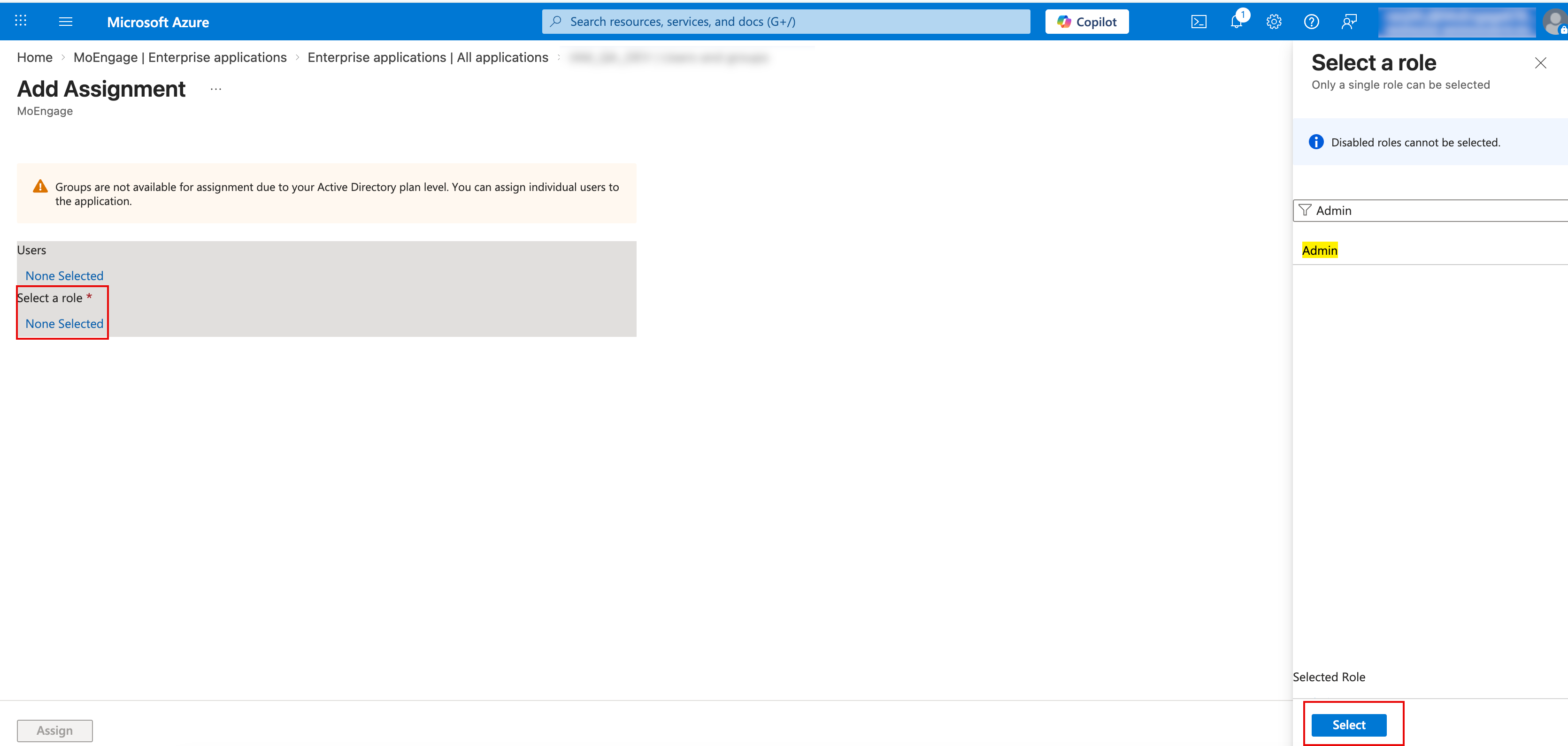 - Under Select a role, click the None Selected link. The Select a role dialog box pane appears on the right side.