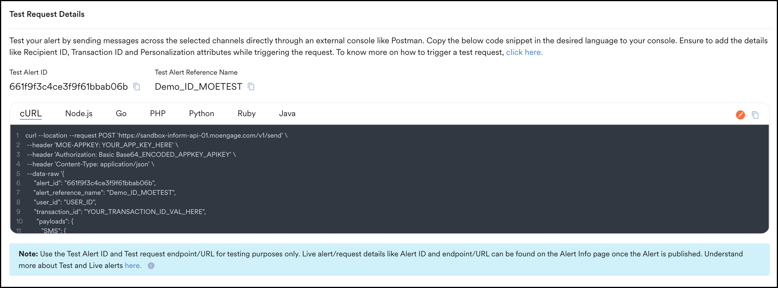 ダッシュボードにテストアラートIDが提供されており、このテストアラートリクエストを外部コンソールに送信します。この値はリクエストに自動的に渡されます。