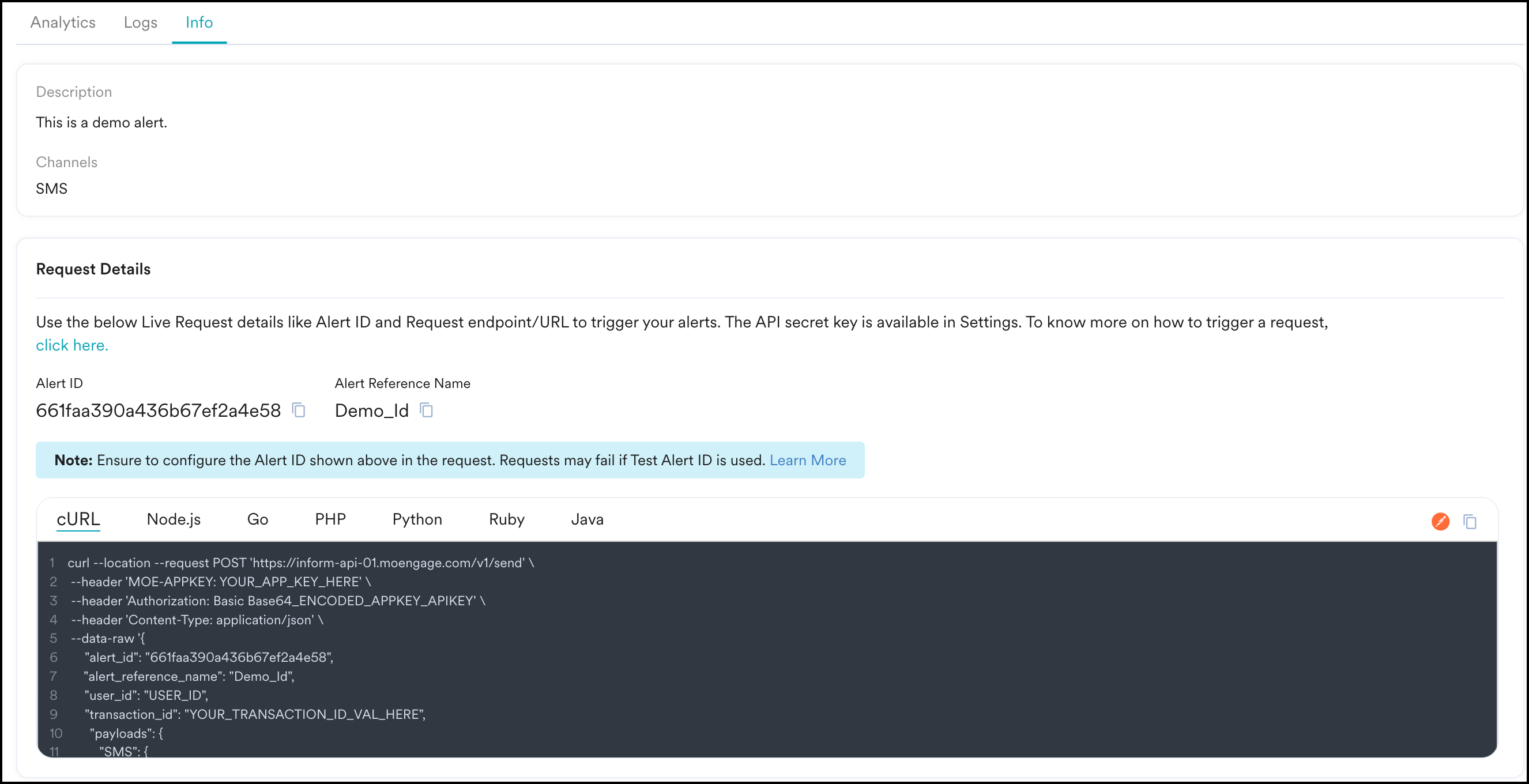 外部コンソールで、以下に示すさまざまな言語のコードスニペットを使用してアラートをテストできます。