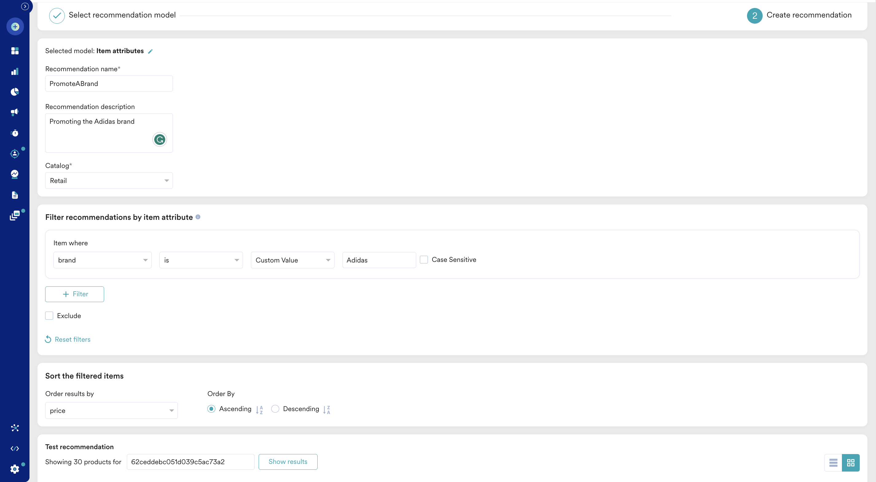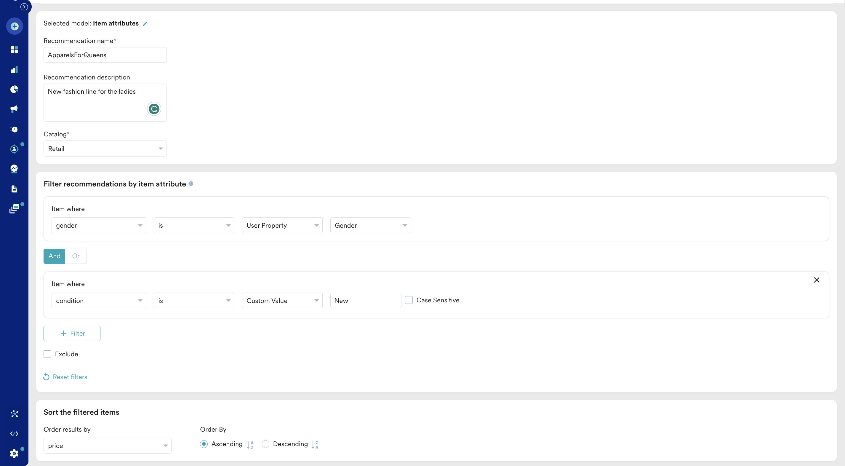 - フィルタリングされたアイテムを並べ替える セクションでは、推奨結果を任意の数値属性で並べ替えます。例えば、価格。