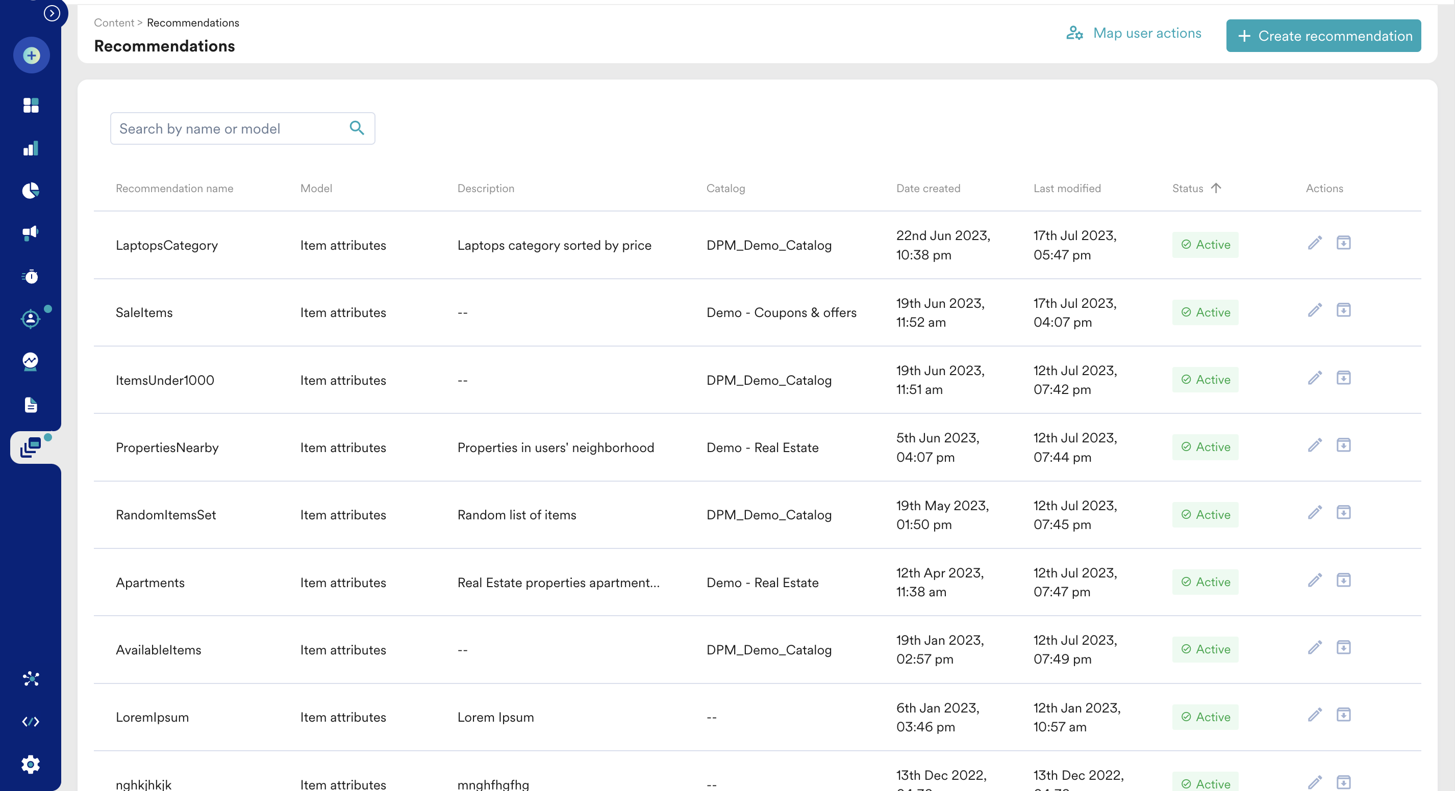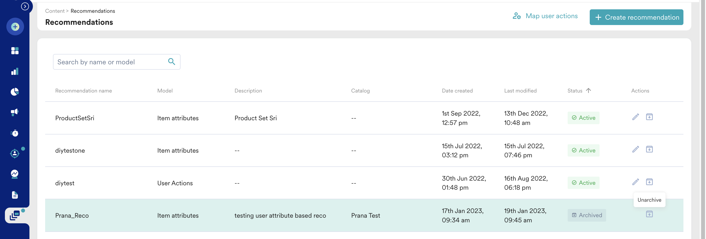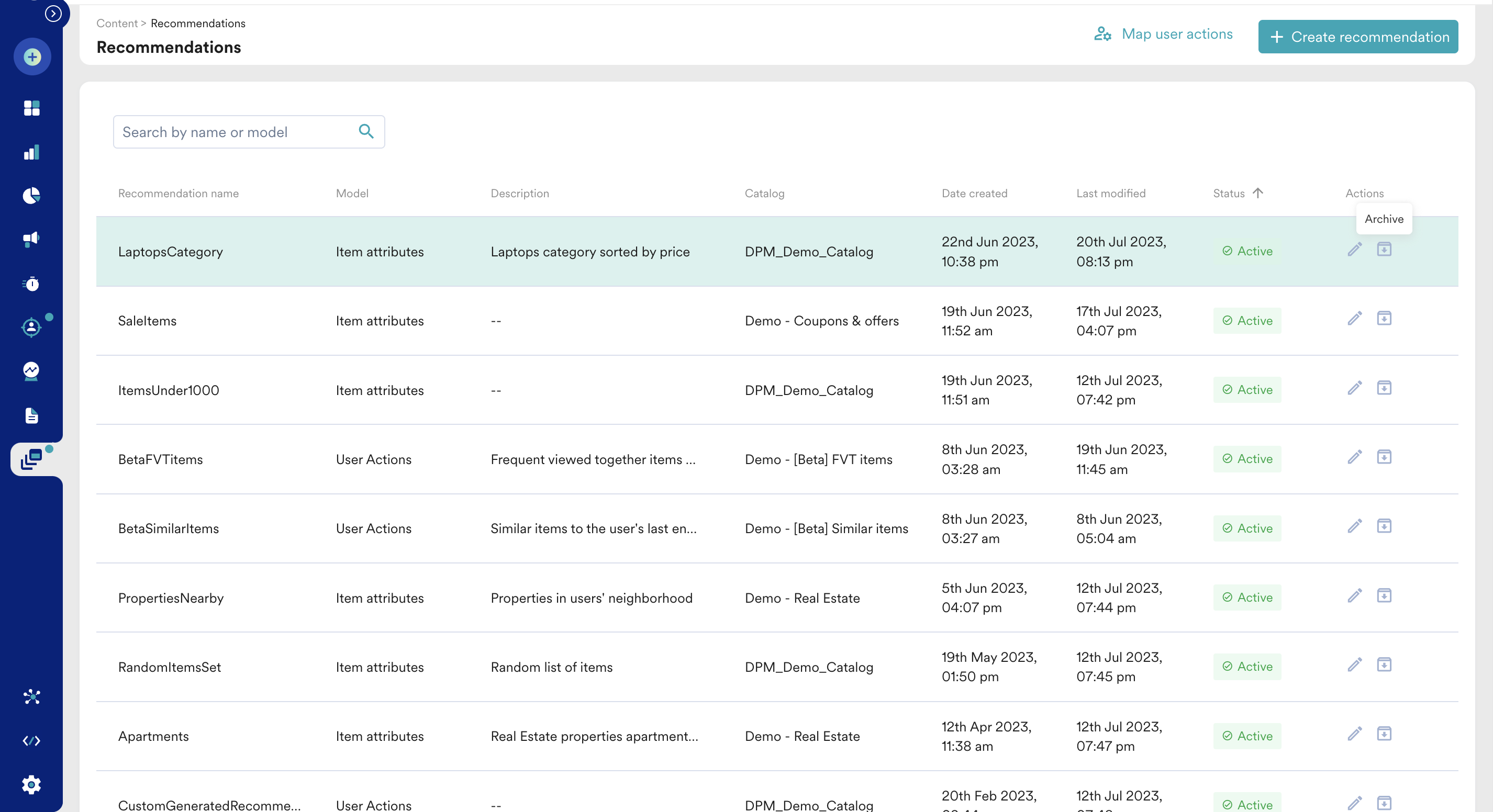 推奨事項ページでは、作成された推奨事項を管理できます。推奨事項のステータスは、リストページ自体に表示されます。推薦を編集、アーカイブ、またはアーカイブ解除できます。