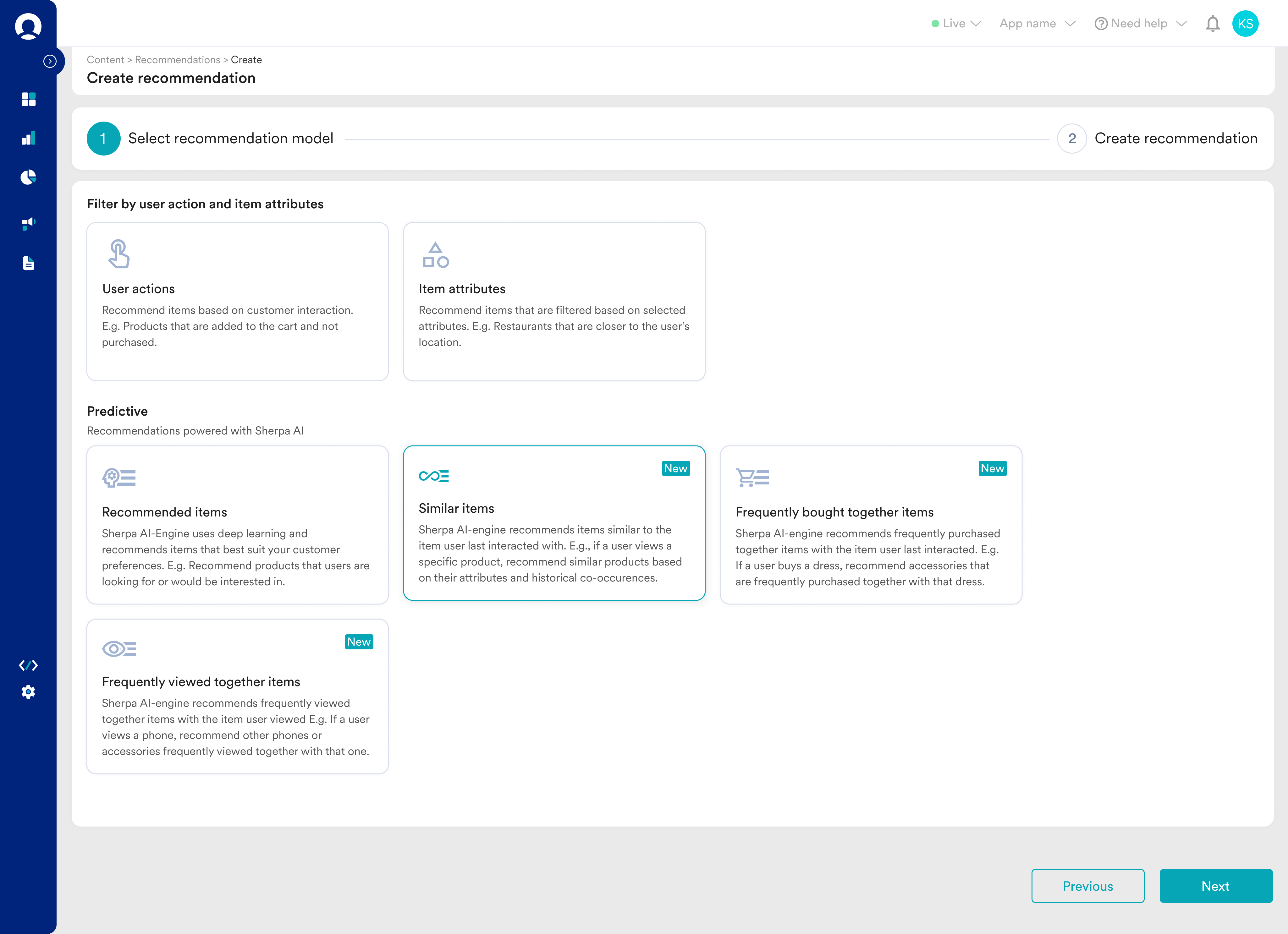 注意: すべてのAI推奨は1つのカタログを考慮します。AI推奨のいずれかでカタログを使用すると、自動的に他のすべてのタイプのAI推奨に設定されます。 -