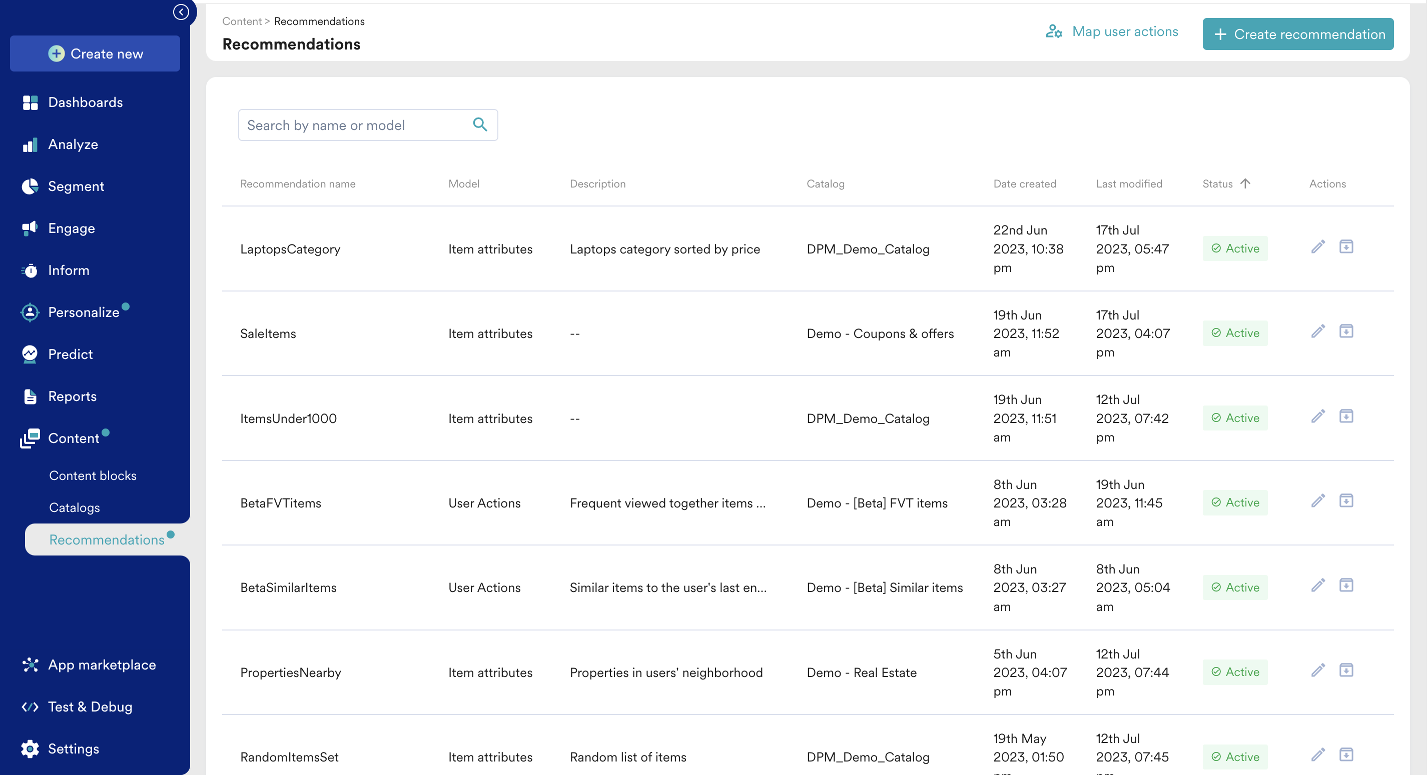 - 推奨が準備できたら、キャンペーンで使用する前にサンプルユーザーで結果をテストできます。