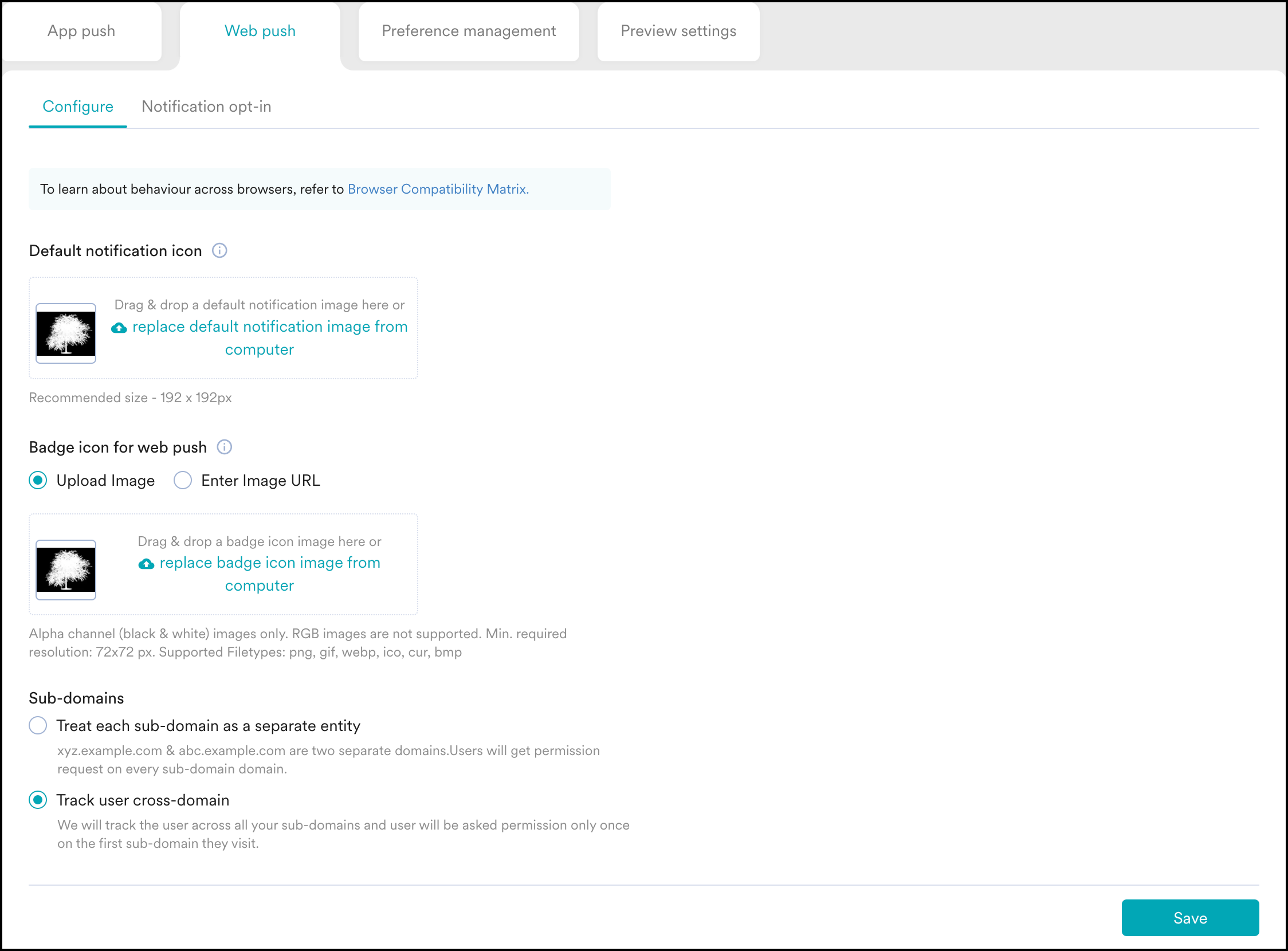 Webプッシュに使用されるデフォルトのプッシュアイコン、サブドメイン、およびバッジを、以下の表に示すように構成できます。プッシュ通知のための設定管理に関する詳細情報は、 こちら を参照してください。
