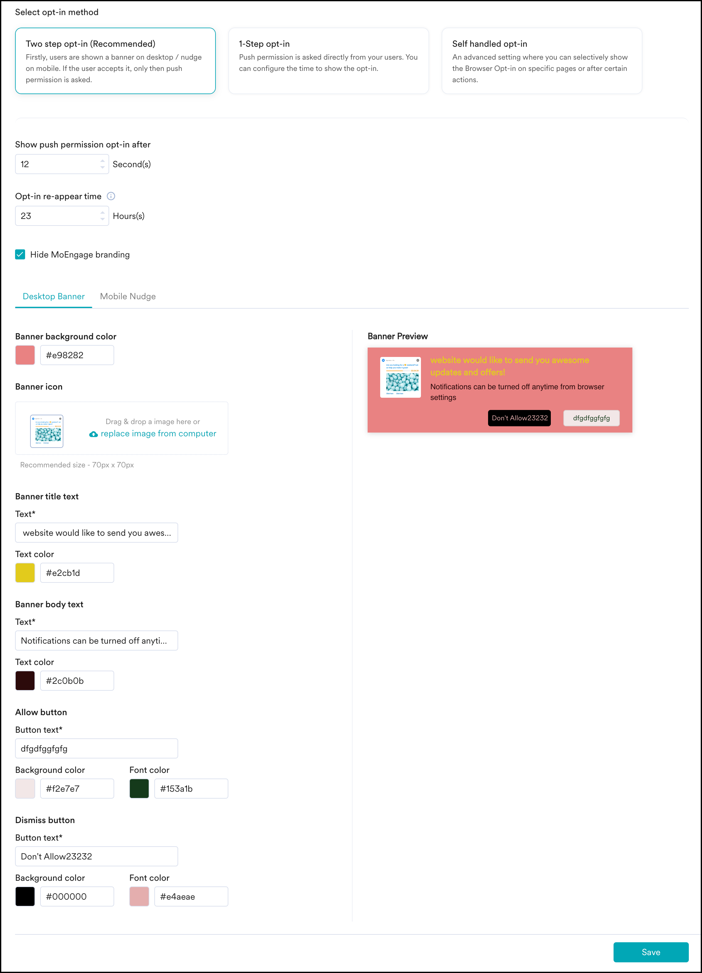 | Moengageのブランドを非表示にする | ソフトアスクとハードアスクに表示されるMoEngageのロゴを非表示にすることができます。 |