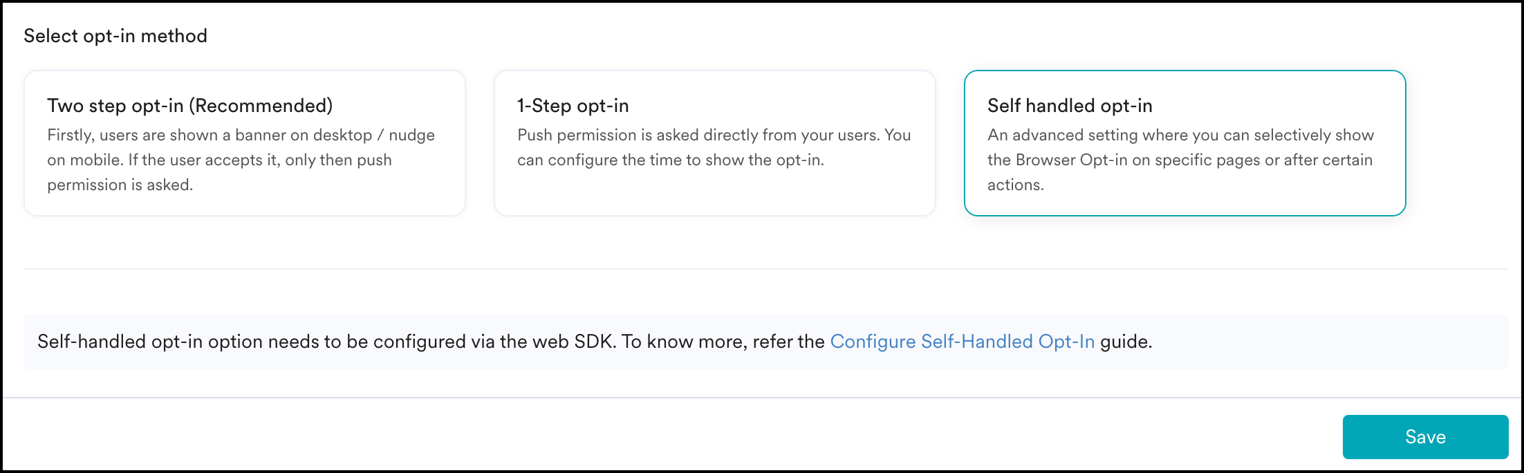 The Self Handled Opt-in can be enabled only with Web SDK Integration. For information about configuring Self-Handled Opt-In, refer to Configure Self-Handled Opt-In .