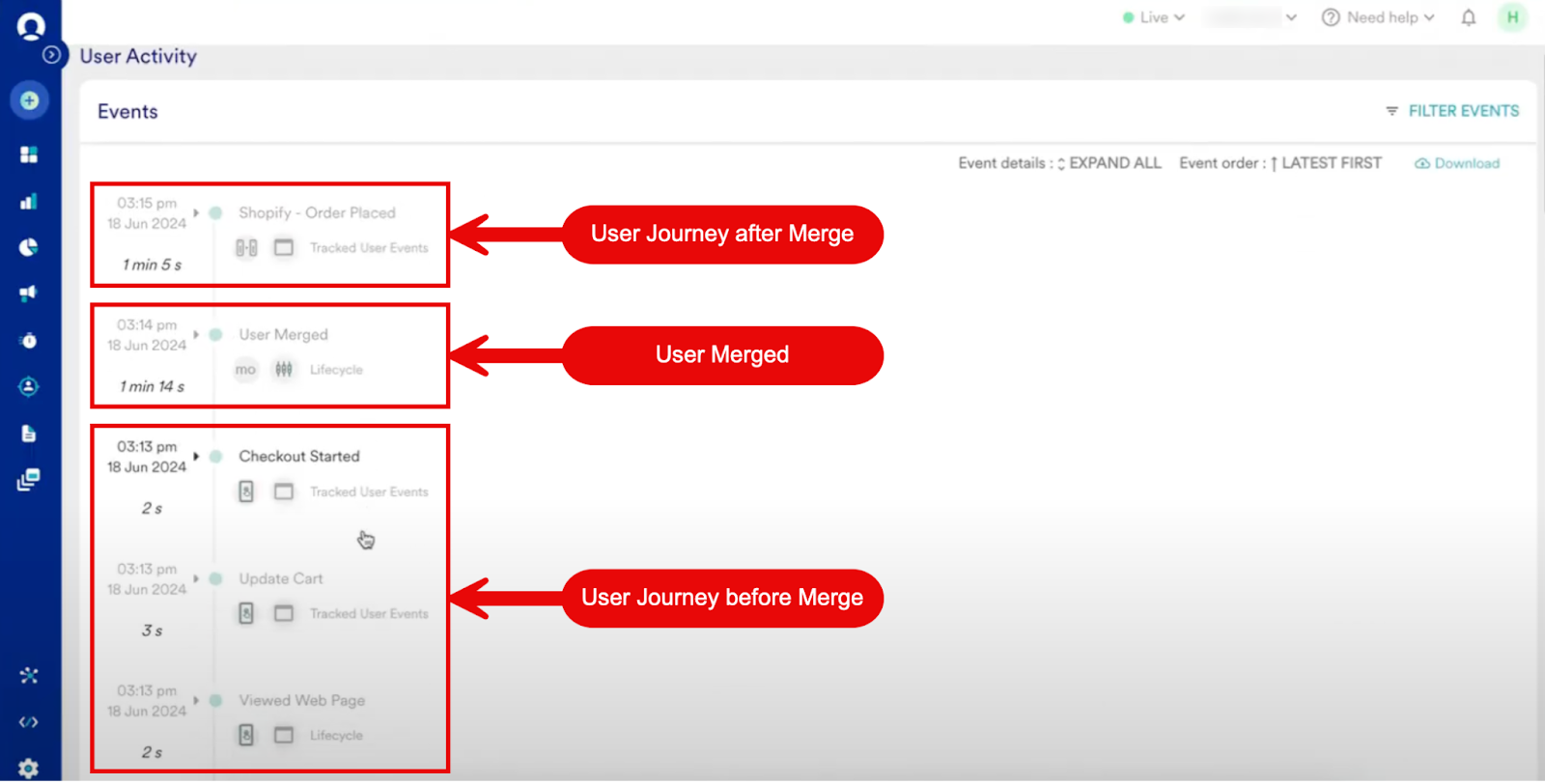 - イベント情報: 統合されたユーザーのすべてのイベントは保持されたユーザーに転送されるため、ユーザー統合中にイベントが失われることはありません。解決されたユーザーは、マージされたすべてのユーザーのイベントを持つことになります。