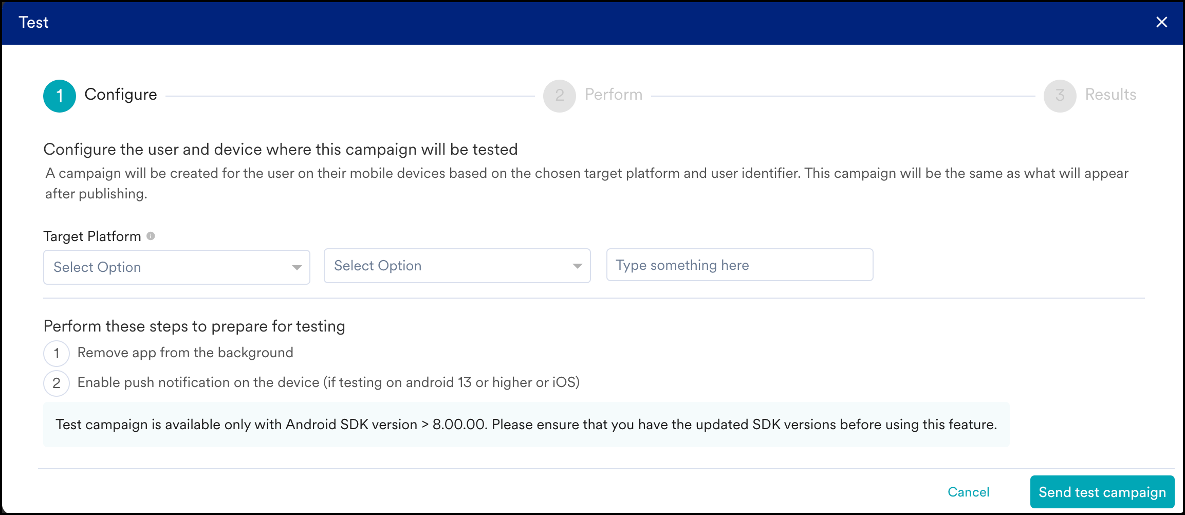 特定の画面によってトリガーされるアプリ内キャンペーンをテストする際に、 これらのステップを実行します の下に追加のステップが表示されます: