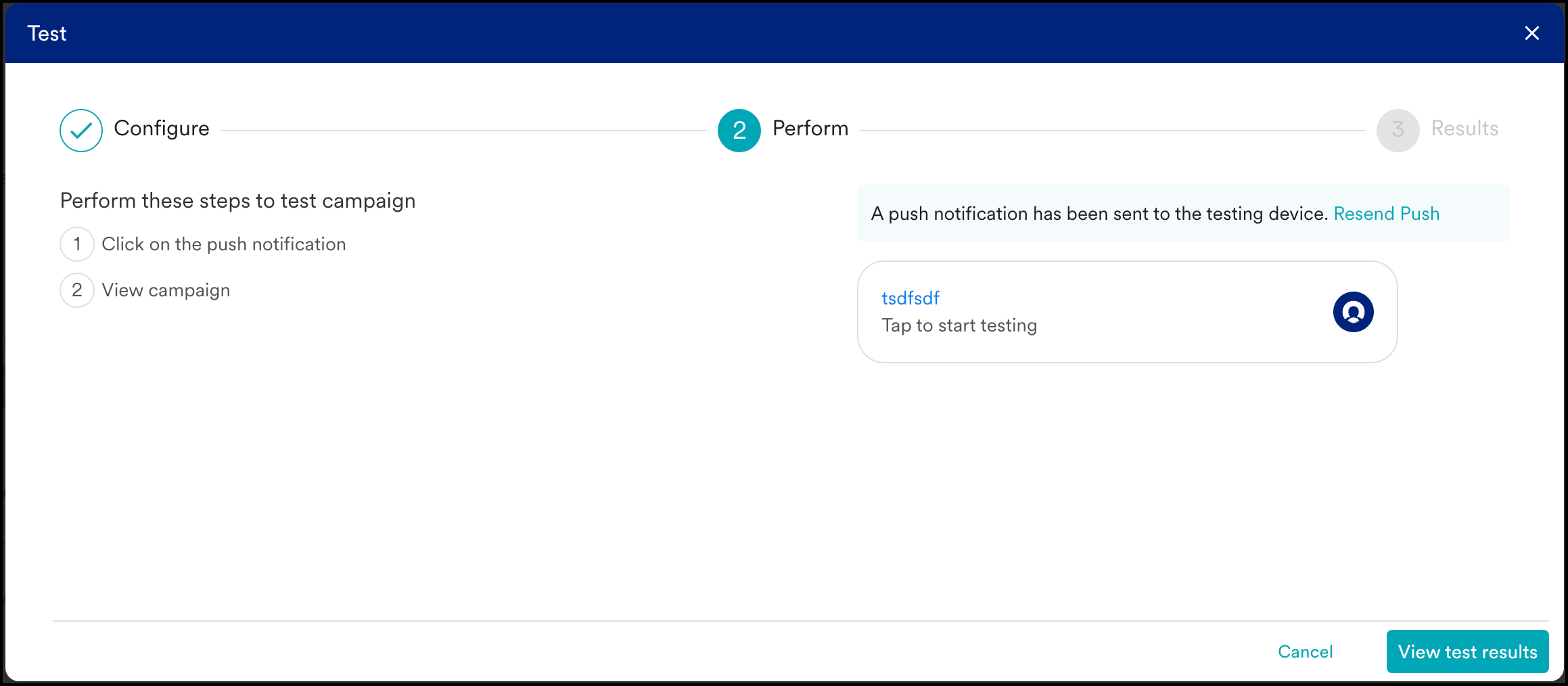 これらの詳細を入力したら、 テストキャンペーンを送信 をクリックしてください。プッシュ通知があなたのデバイスに送信されました。次のステージに進んでテストを続けてください。