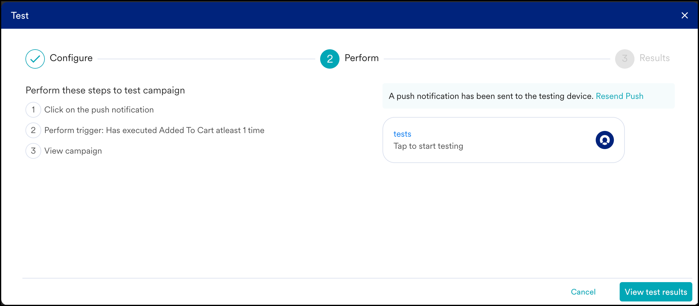 このステージでは、キャンペーンをテストするために実行するアクションのリストが表示されます。これらのアクションは、キャンペーン作成時に設定したトリガーに基づいて異なります: