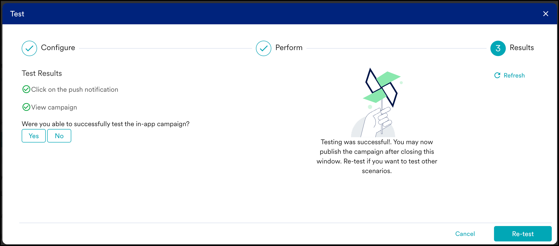 テスト結果画面では、アプリ内キャンペーンが正常に実行されたかどうかが表示されます: