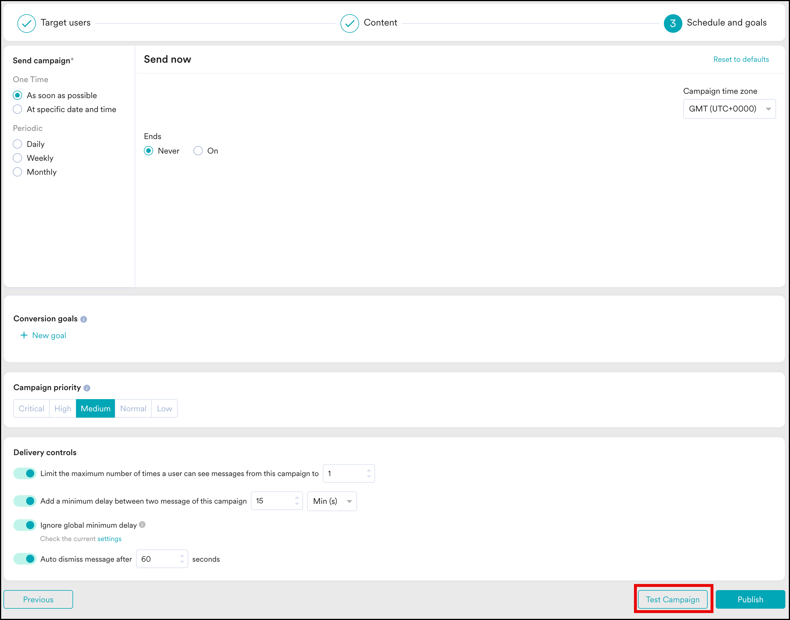 - キャンペーン作成プロセスの3番目のステップで、 テストキャンペーン をクリックします。