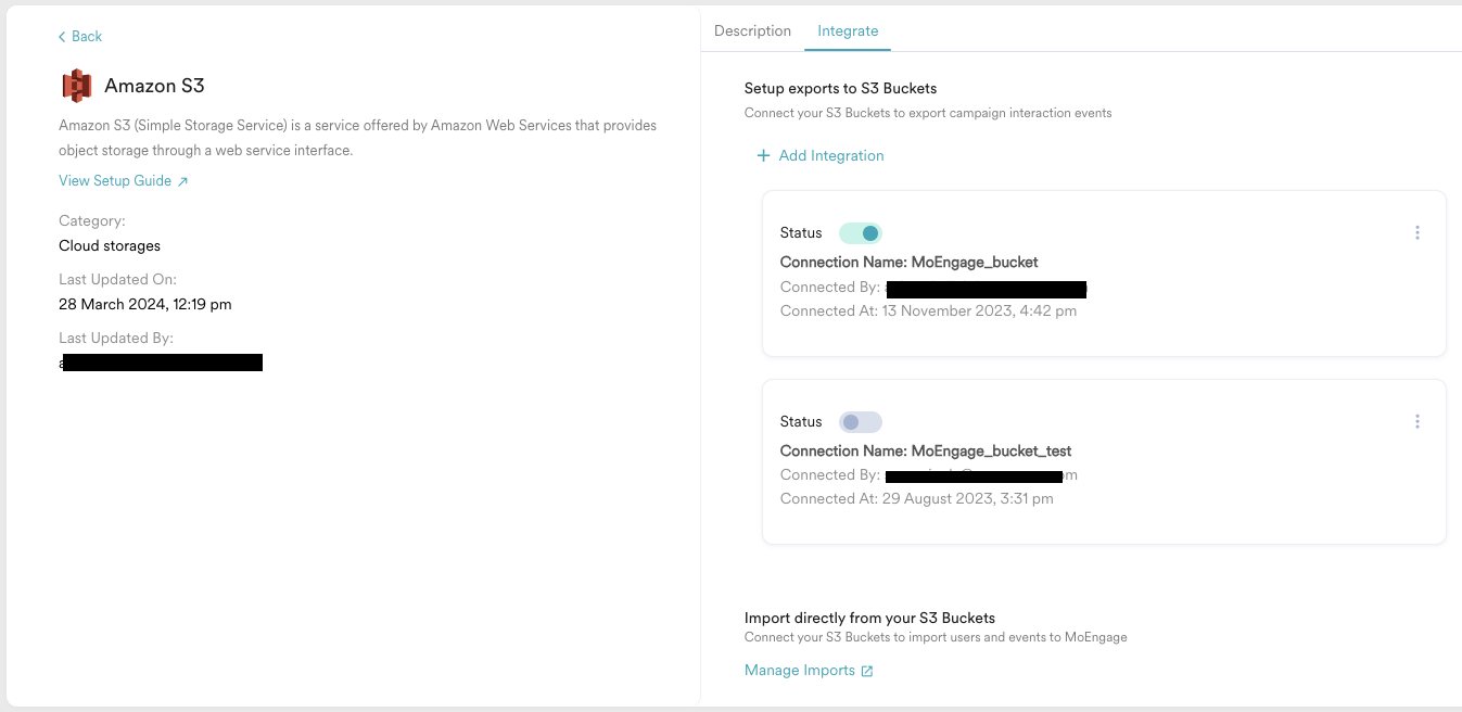 - あなたのMoEngageダッシュボードで アプリマーケットプレイス > Amazon S3 > 統合 に移動します。
