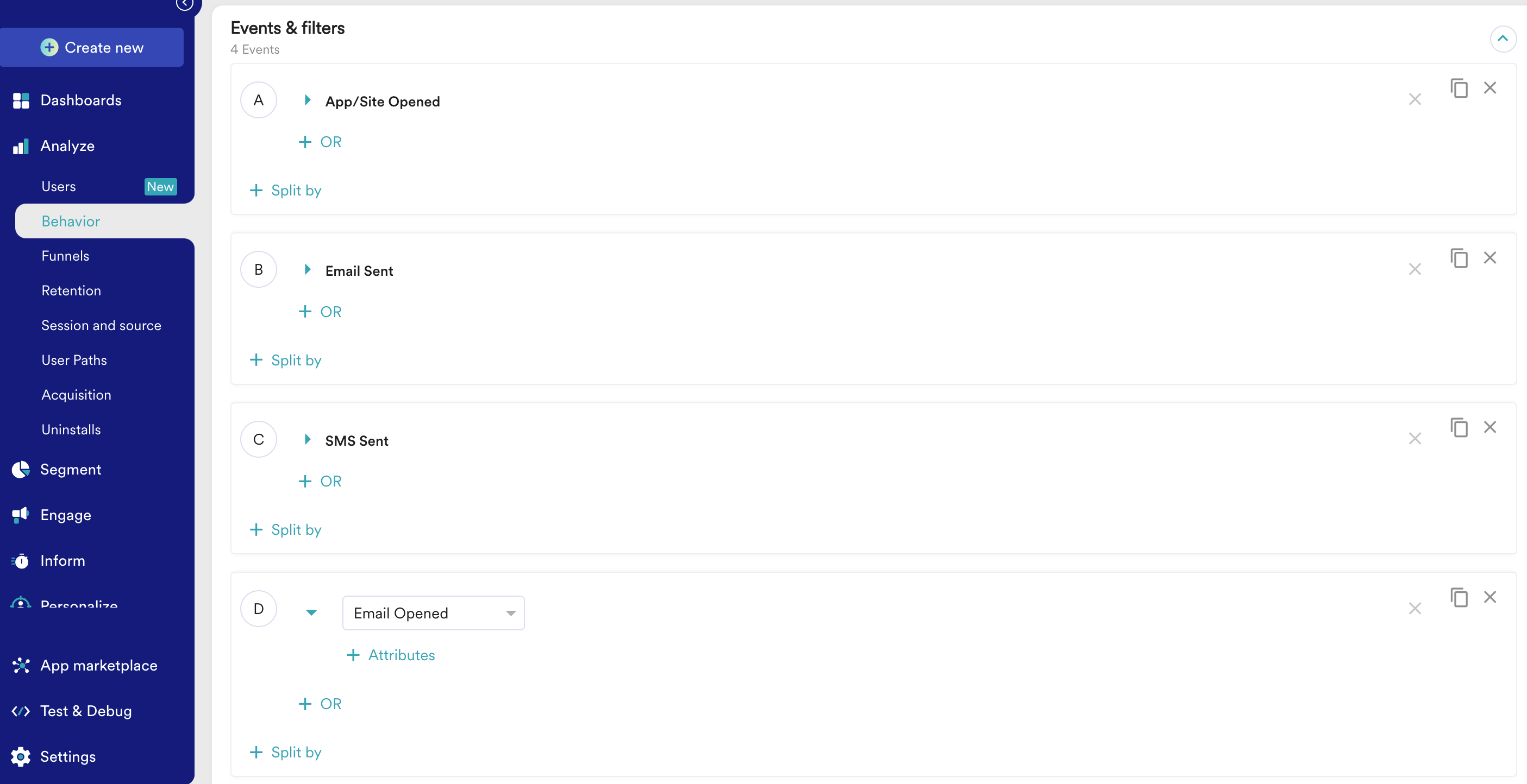 - あなたのMoEngageダッシュボードで 分析 > 行動 に移動します。