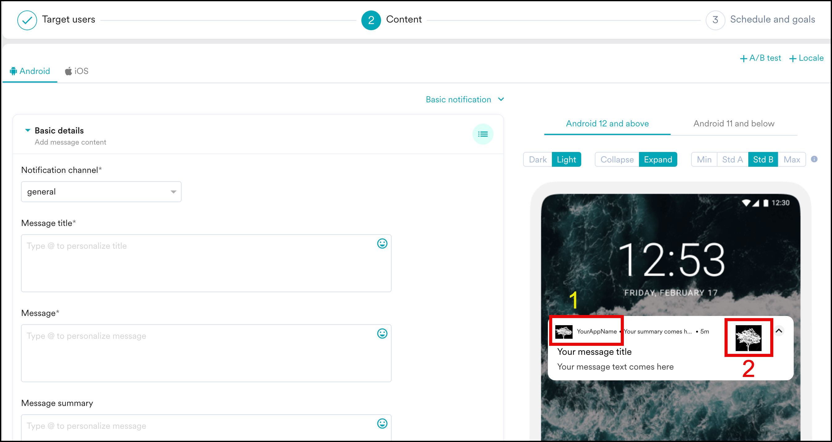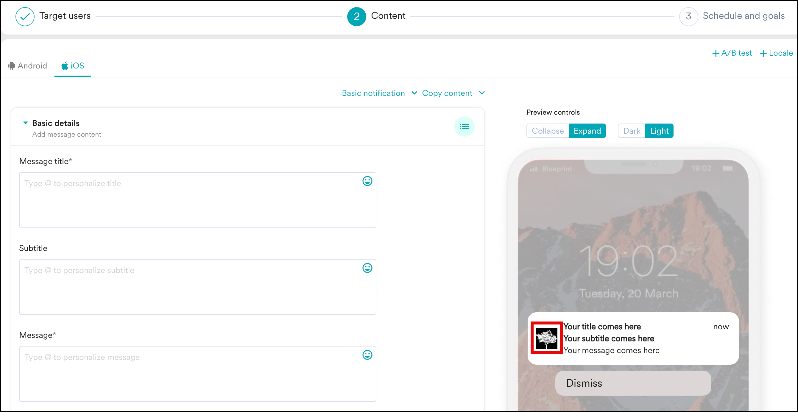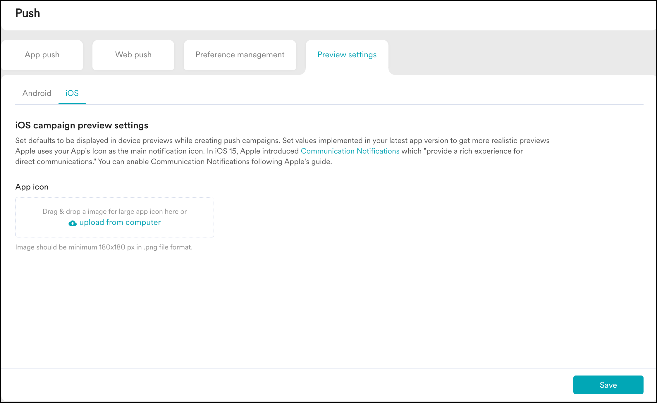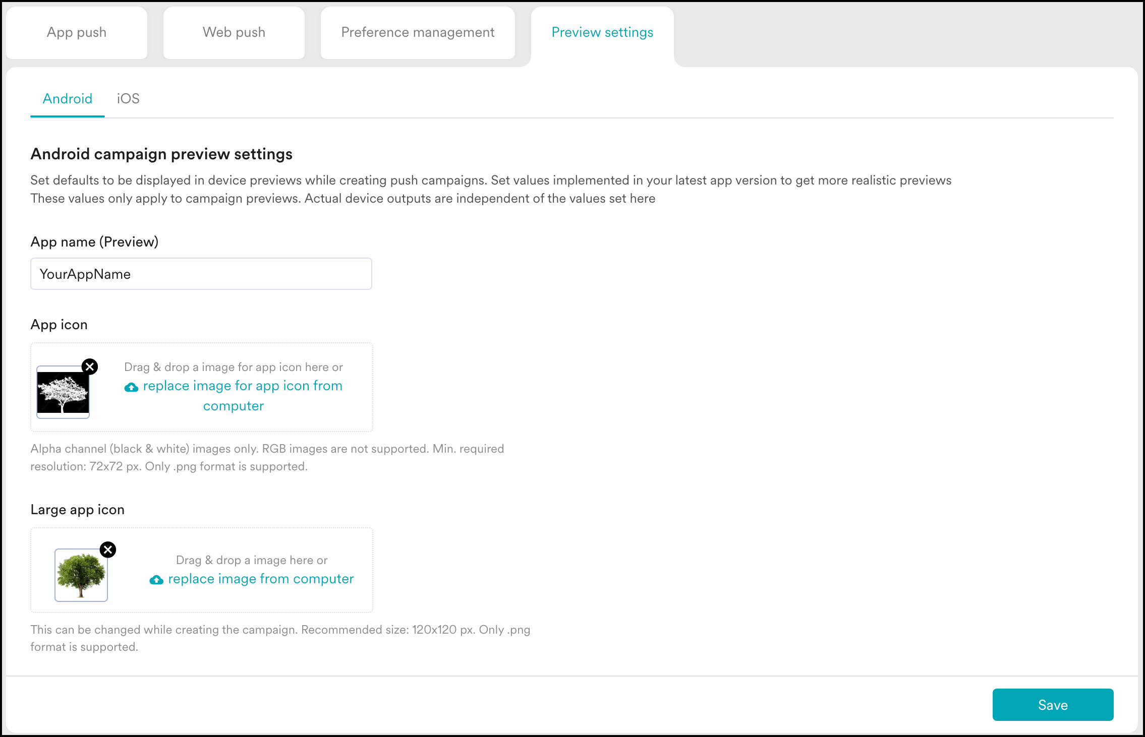 プッシュのプレビュー設定を使用すると、キャンペーン作成プロセスの2番目のステップでデバイスプレビューに表示されるアイコンとテキストを変更できます。