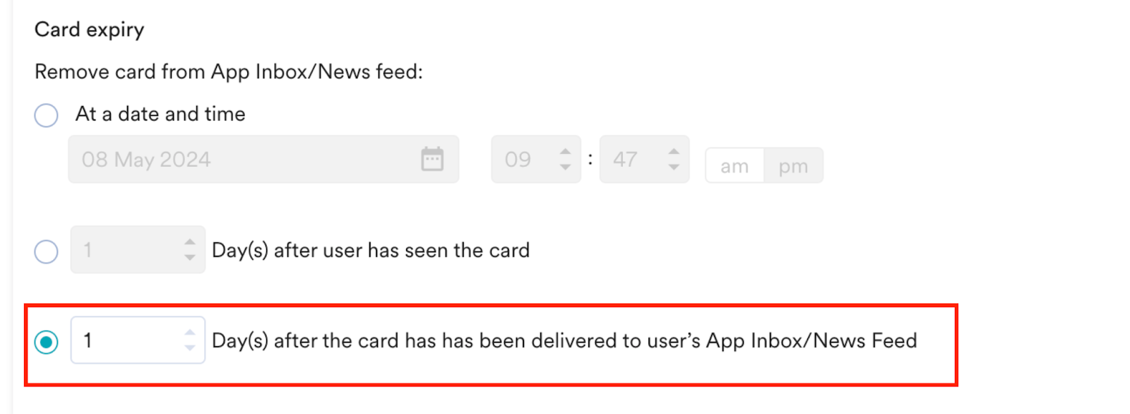 情報 MoEngageでは、カードの有効期限は配信時間に基づく計算によって決定されます。 |