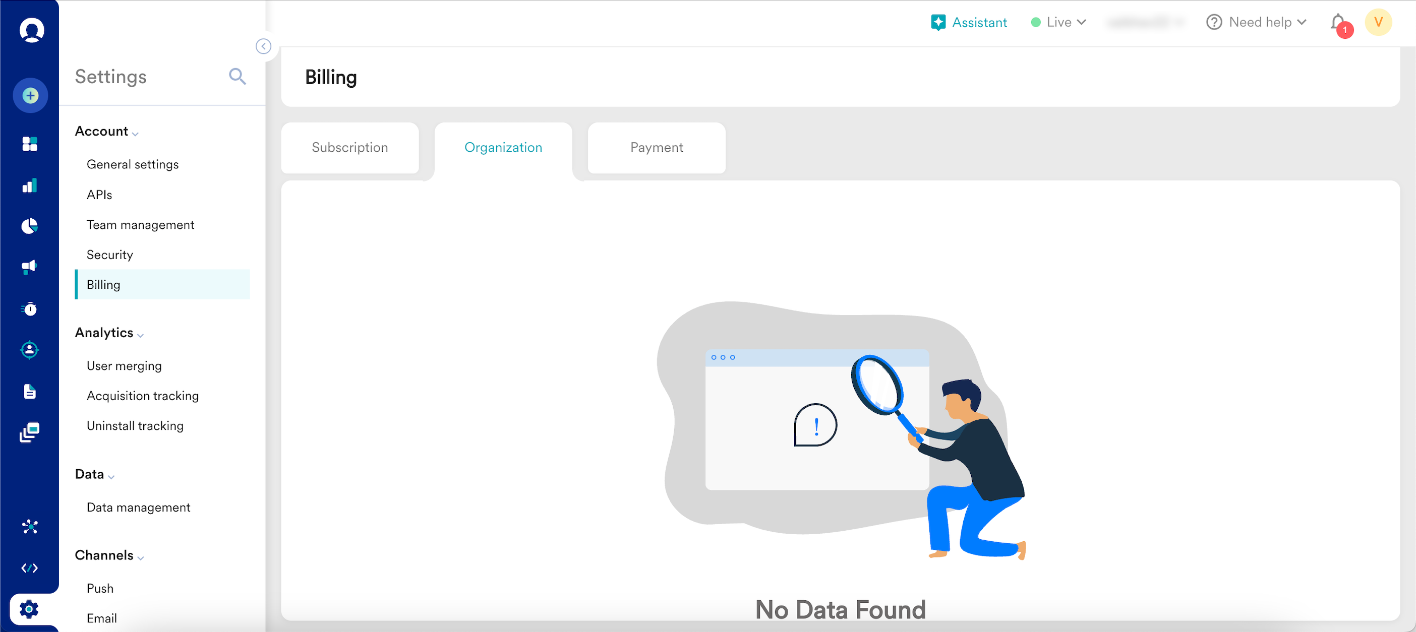- MoEngageダッシュボードの左側のナビゲーションメニューで、 設定 > 請求 をクリックします。