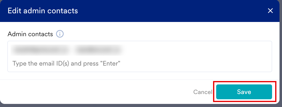」ポップアップウィンドウで、必要に応じて既存の管理者連絡先を編集します。複数のメールアドレスを追加でき、カンマで区切り、Enterキーを押してください。