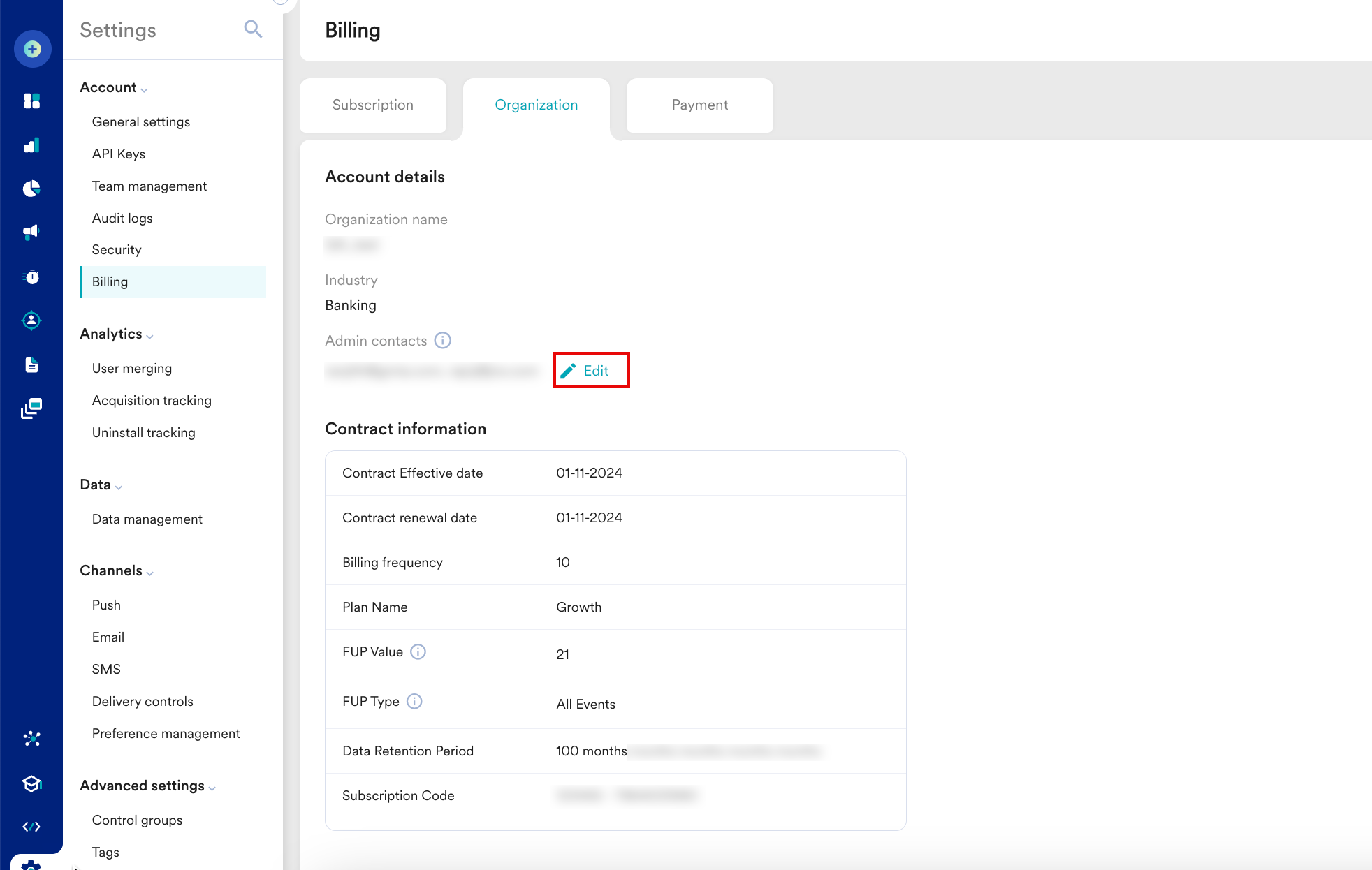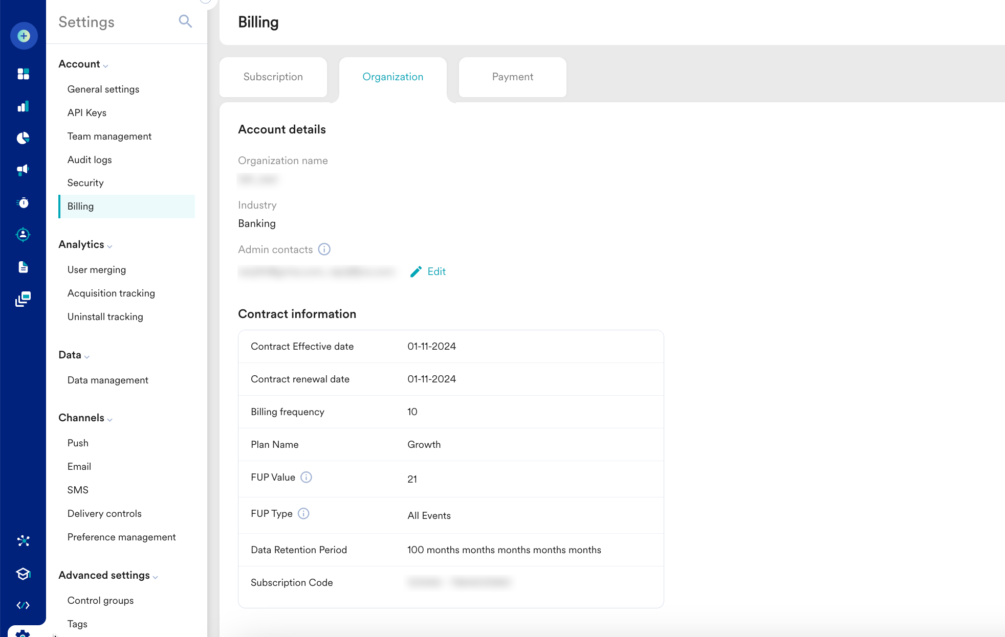 この 組織 タブでは、あなたの組織とMoEngageとの契約の詳細が提供されます。