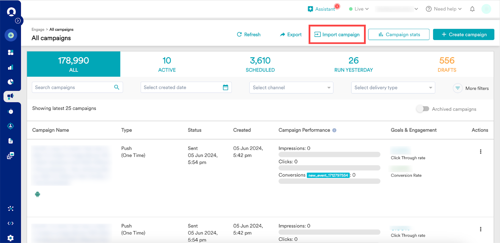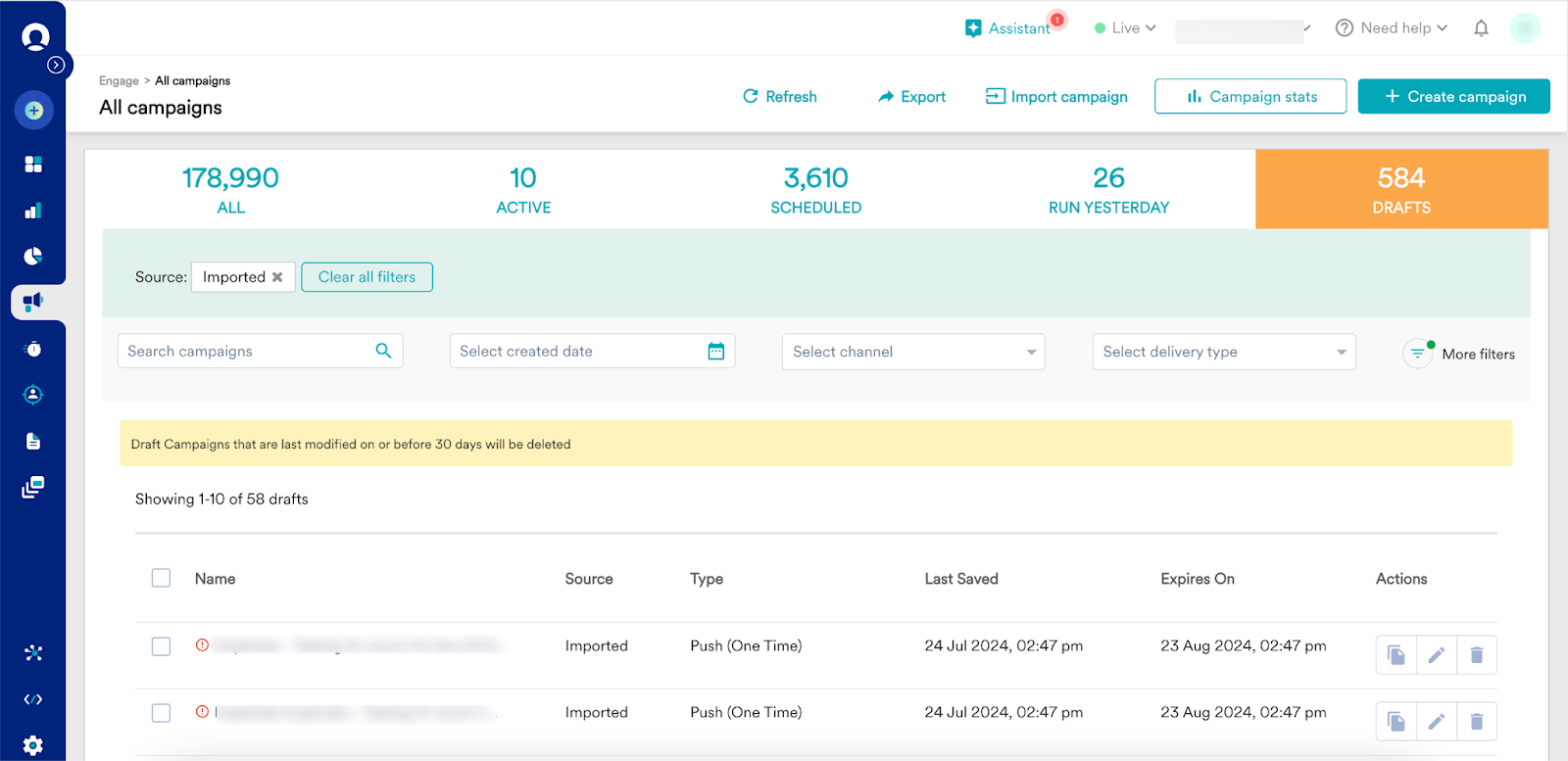 - MoEngageダッシュボードにログインし、すべてのキャンペーンページに移動します。