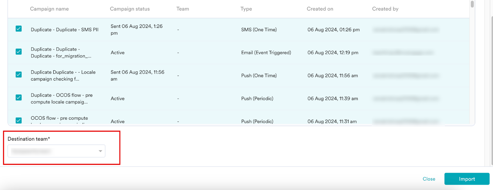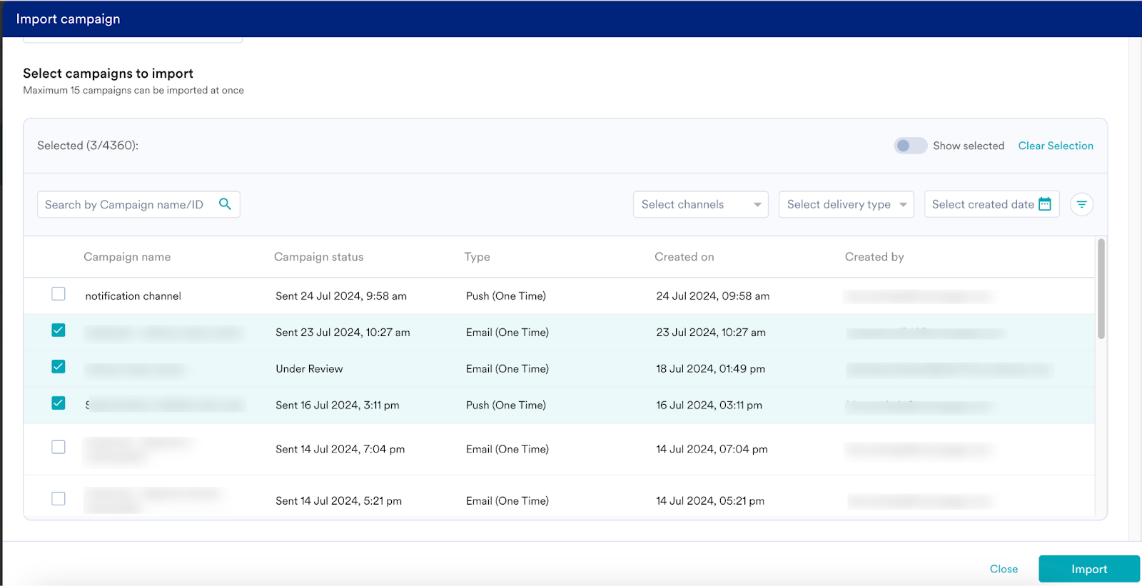 - キャンペーンをフィルタリングします。 チャネル 、 配信タイプ 、 作成日 、 ステータス 、 キャンペーンタグ 、および 作成者 に基づいてフィルタリングできます。ドラフト以外のステータスのキャンペーンを移行できることに注意してください。一度にインポートする最大15件のキャンペーンを選択できます。