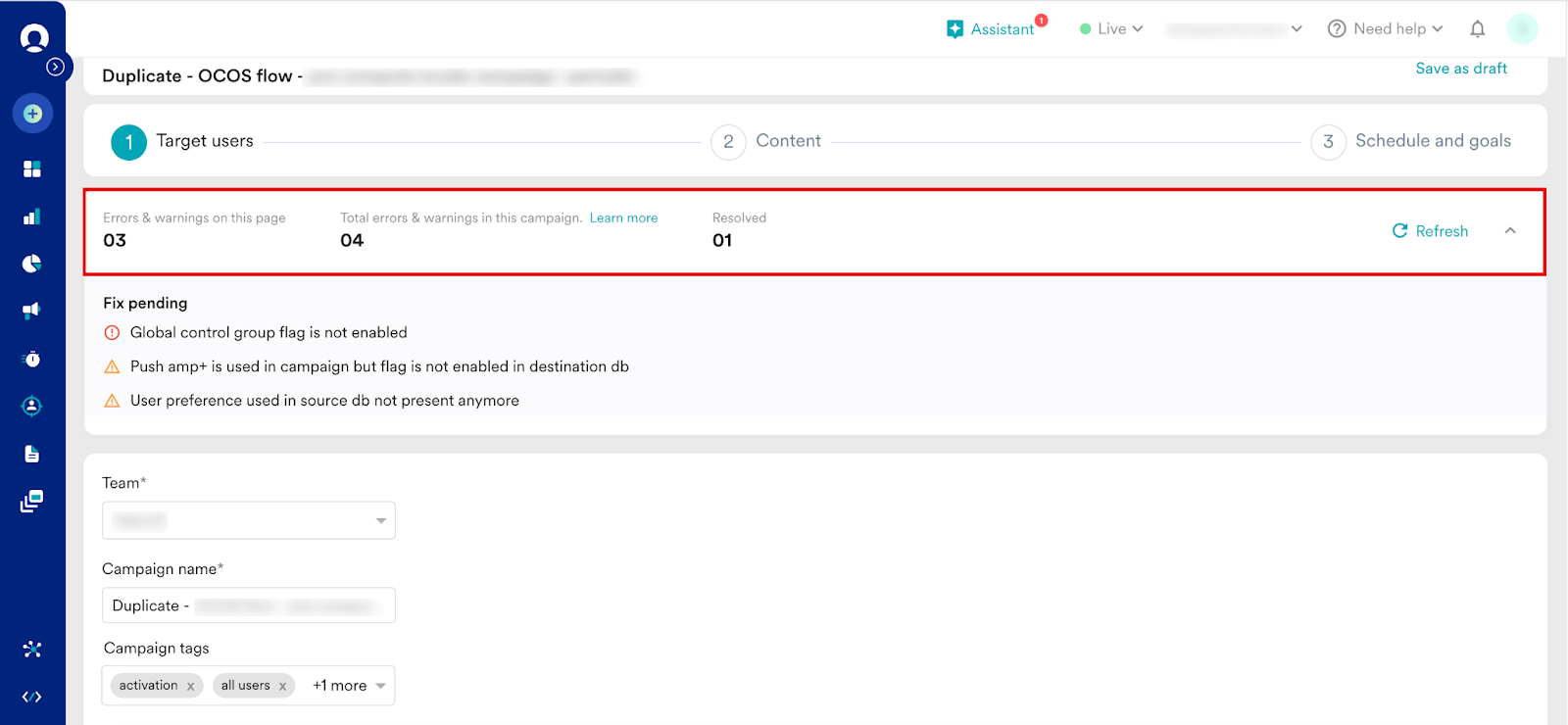 エラーまたは警告のあるインポートされたキャンペーン名を DRAFTS タブのすべてのキャンペーンページでクリックすると、ドラフトモードのインポートされたキャンペーンに移動します。キャンペーンの各ステップの上部には、以下の情報が含まれているセクションが表示されます: