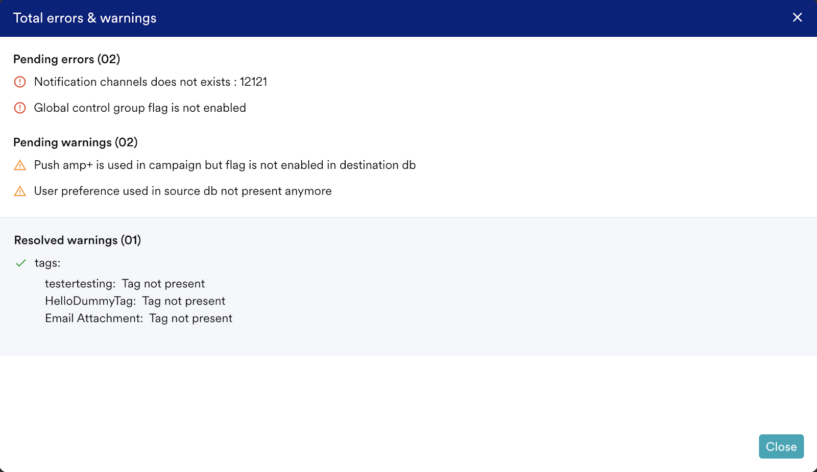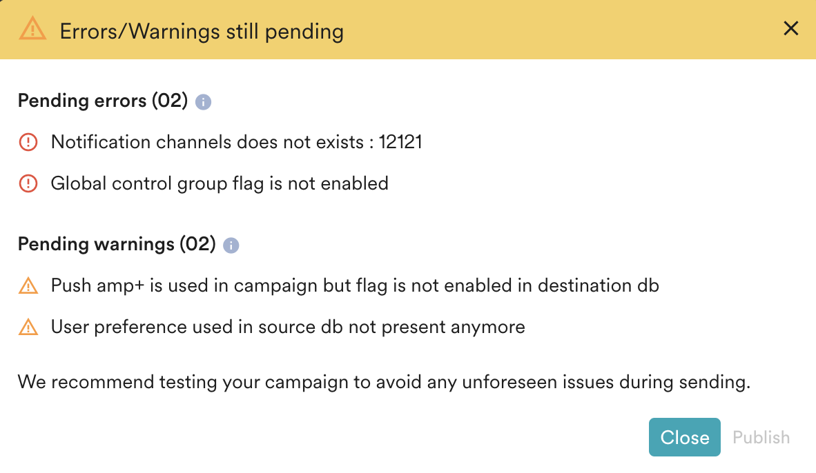 をクリックしてキャンペーンを公開します。エラーや警告を修正せずにキャンペーンを公開すると、エラー/警告が保留中のポップアップウィンドウが表示されます。このウィンドウには、すべての保留中のエラーと警告が表示されます。キャンペーンを正常に配信するには、これらすべてを修正する必要があります。警告があるキャンペーンは公開できますが、エラーがあるキャンペーンは公開できないことに注意してください。
