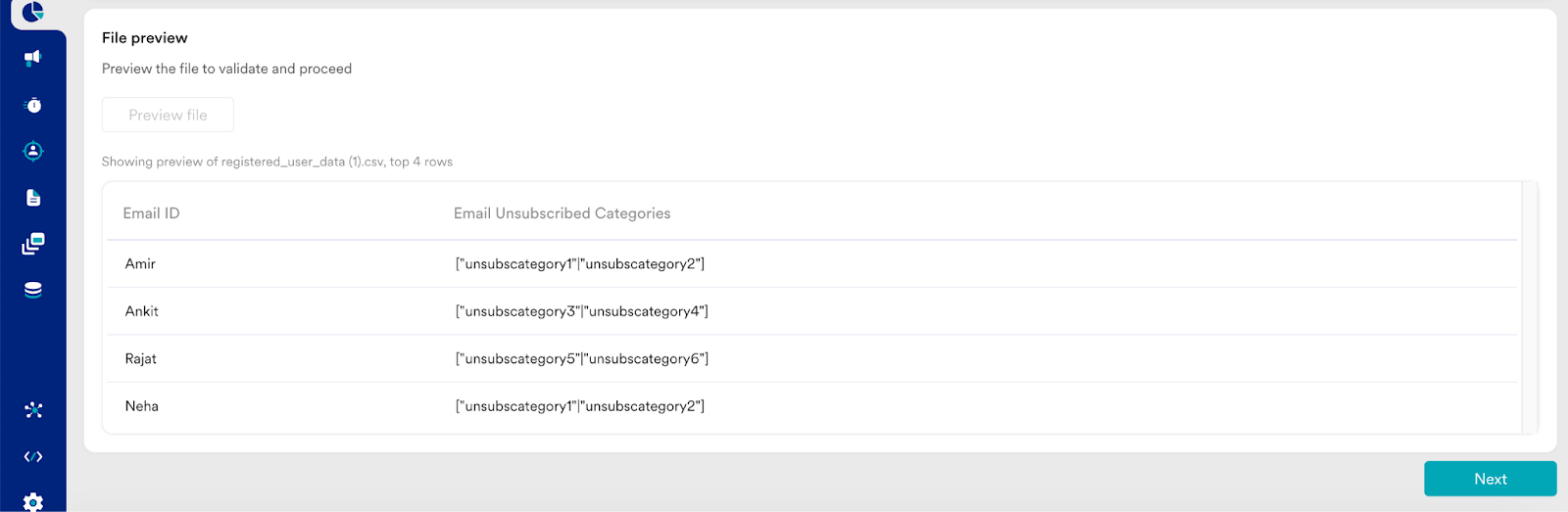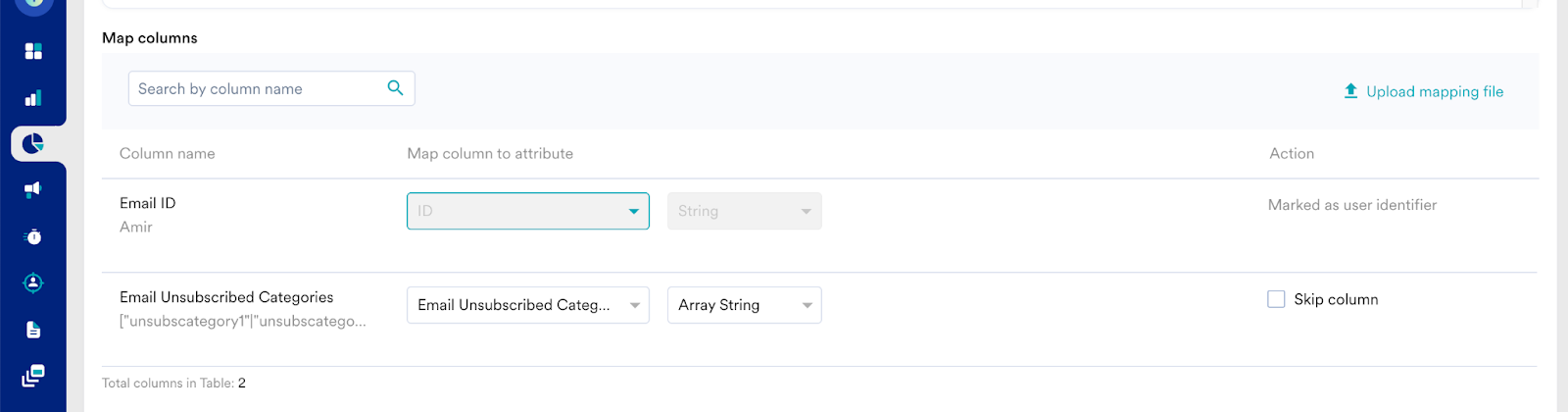 - MoEngageでユーザーを識別するために使用されるユーザー識別子と、2つの異なる列としての退会状況を含むCSVファイルを用意してください。