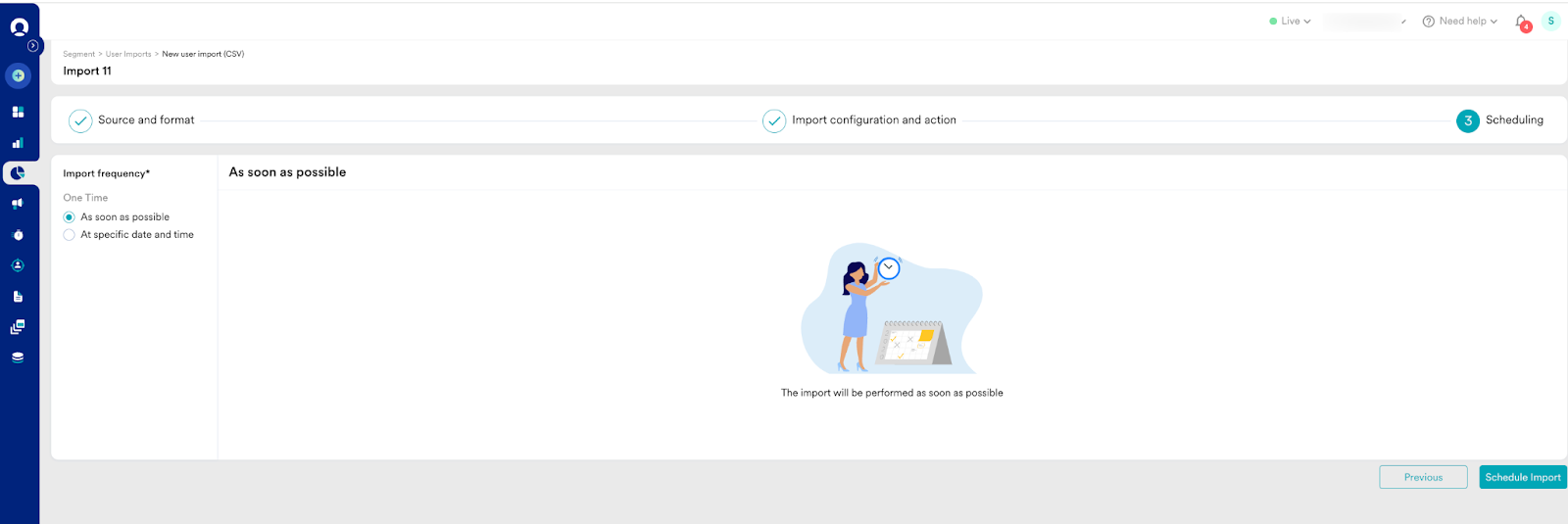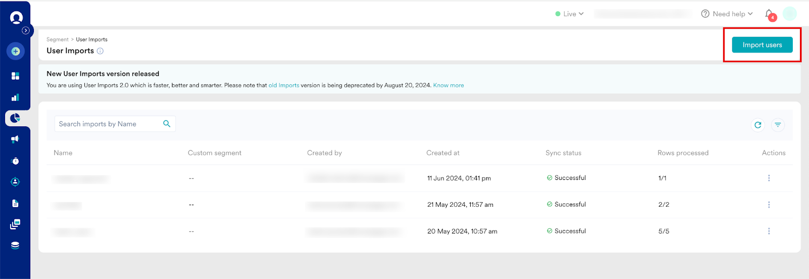 - MoEngageダッシュボードの左側のナビゲーションメニューで、 セグメント をクリックし、次に ユーザーインポート をクリックします。