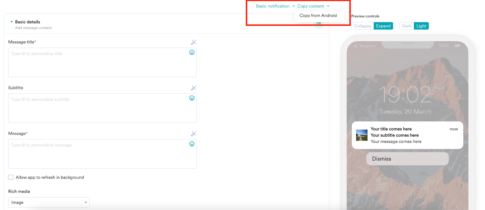 - 製品の通常の動作は、ディープリンクがAndroidからiOSのプッシュ通知にコピーされないことです。