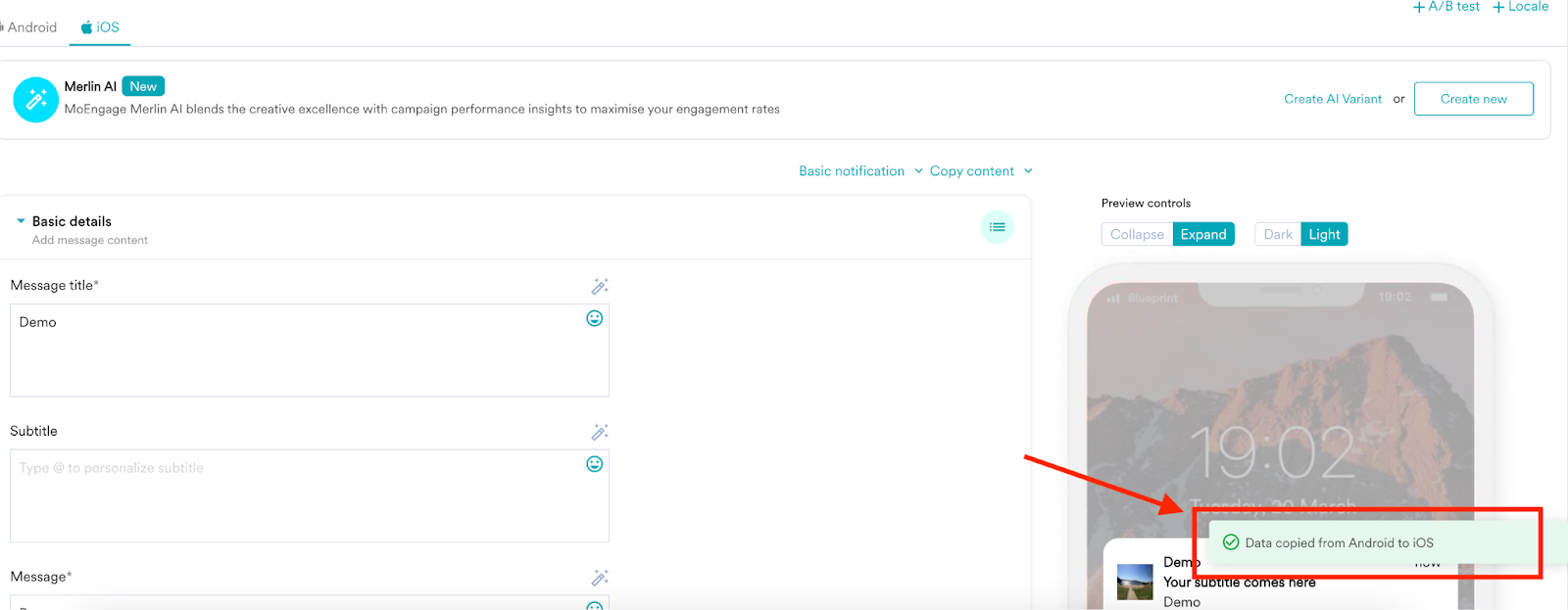 AndroidからiOSのプッシュ通知にディープリンクはコピーされません。