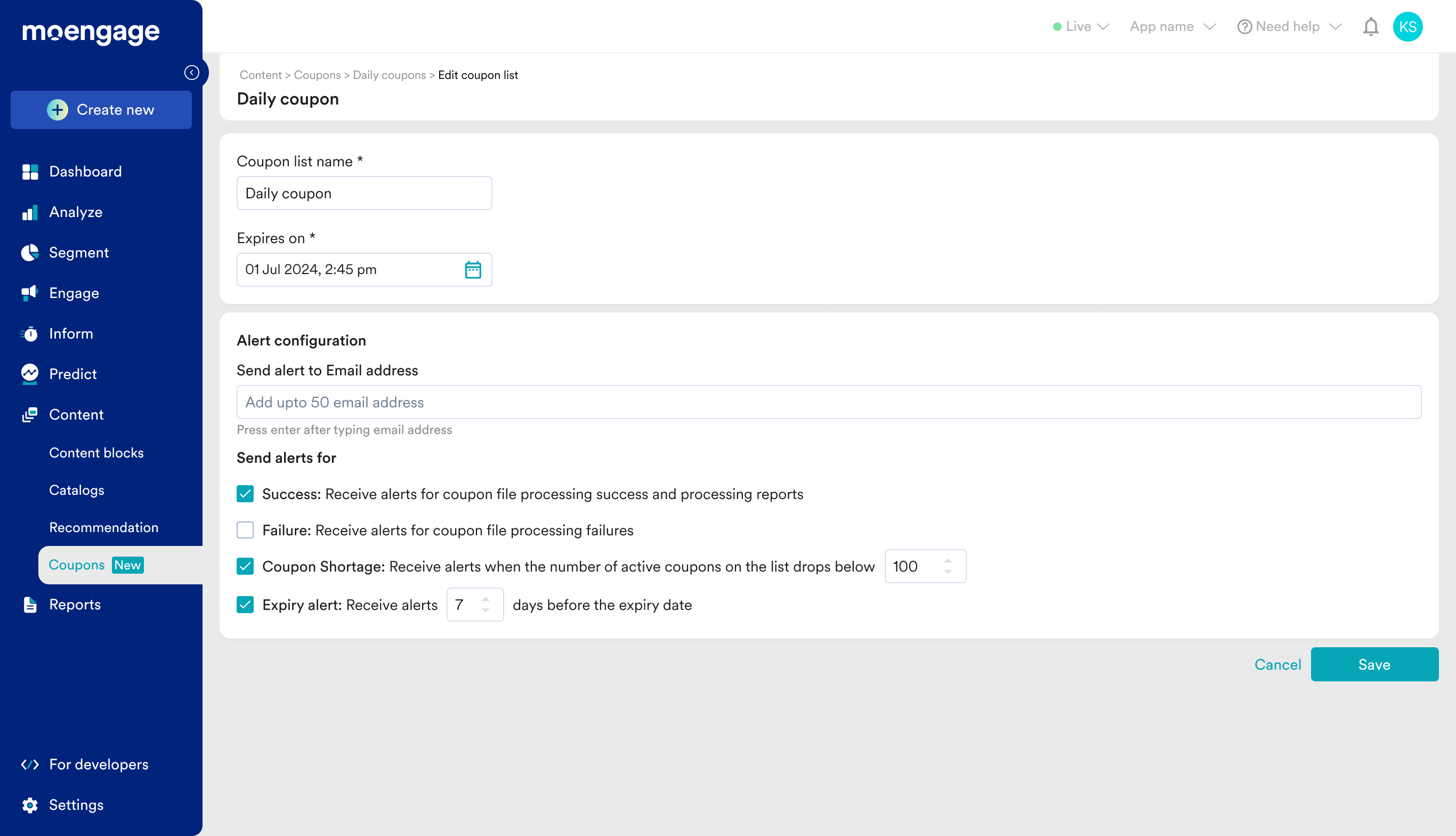 - もし 有効期限 が過去の日付である場合、クーポンリストの新しい希望の有効期限を更新してください。リストの有効期限が切れると、MoEngageシステムから削除されます。その結果、このクーポンリストを参照するキャンペーンは、コードを取得することができません。