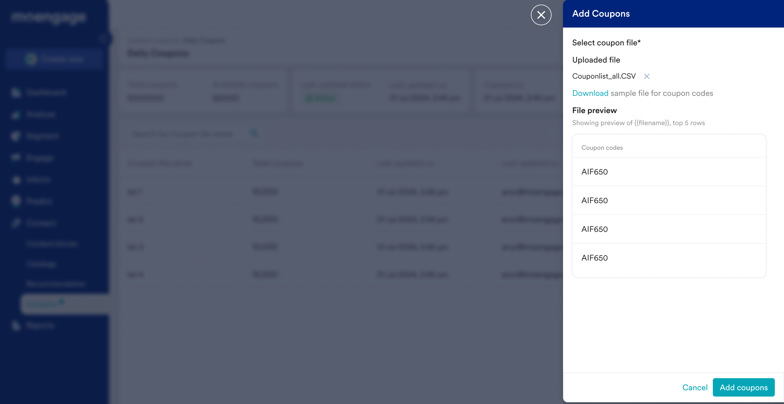 - このアクションを実行すると、クーポンファイルを添付するためのオーバーレイページが開きます。 U クーポンを含むCSVファイルを あなたのシステムからアップロードしてください。あなたのCSVファイルには「クーポンコード」というヘッダーが必要です。さらに、 サンプルファイルをダウンロード して、フォーマットを確認することもできます。