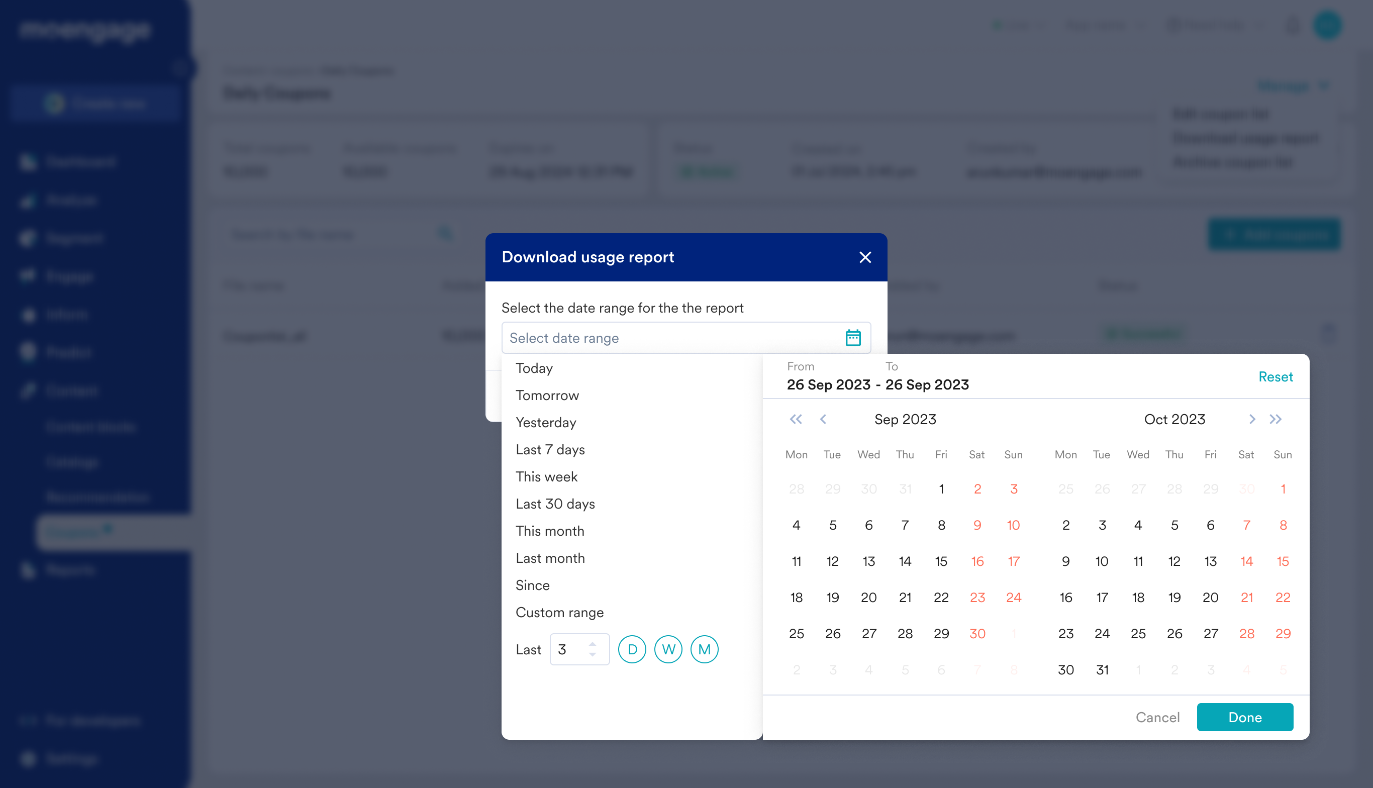 MoEngageはクーポンコードの引き換えを確認しません。クーポンベースのキャンペーンにおいて、MoEngageの役割は、ユニークなコードをランダムに割り当て、それらを設定されたマーケティングチャネル全体に配布することです。異なるキャンペーンで使用されたクーポンリストの監査報告書を生成できます。こちらは サンプル使用レポート です。