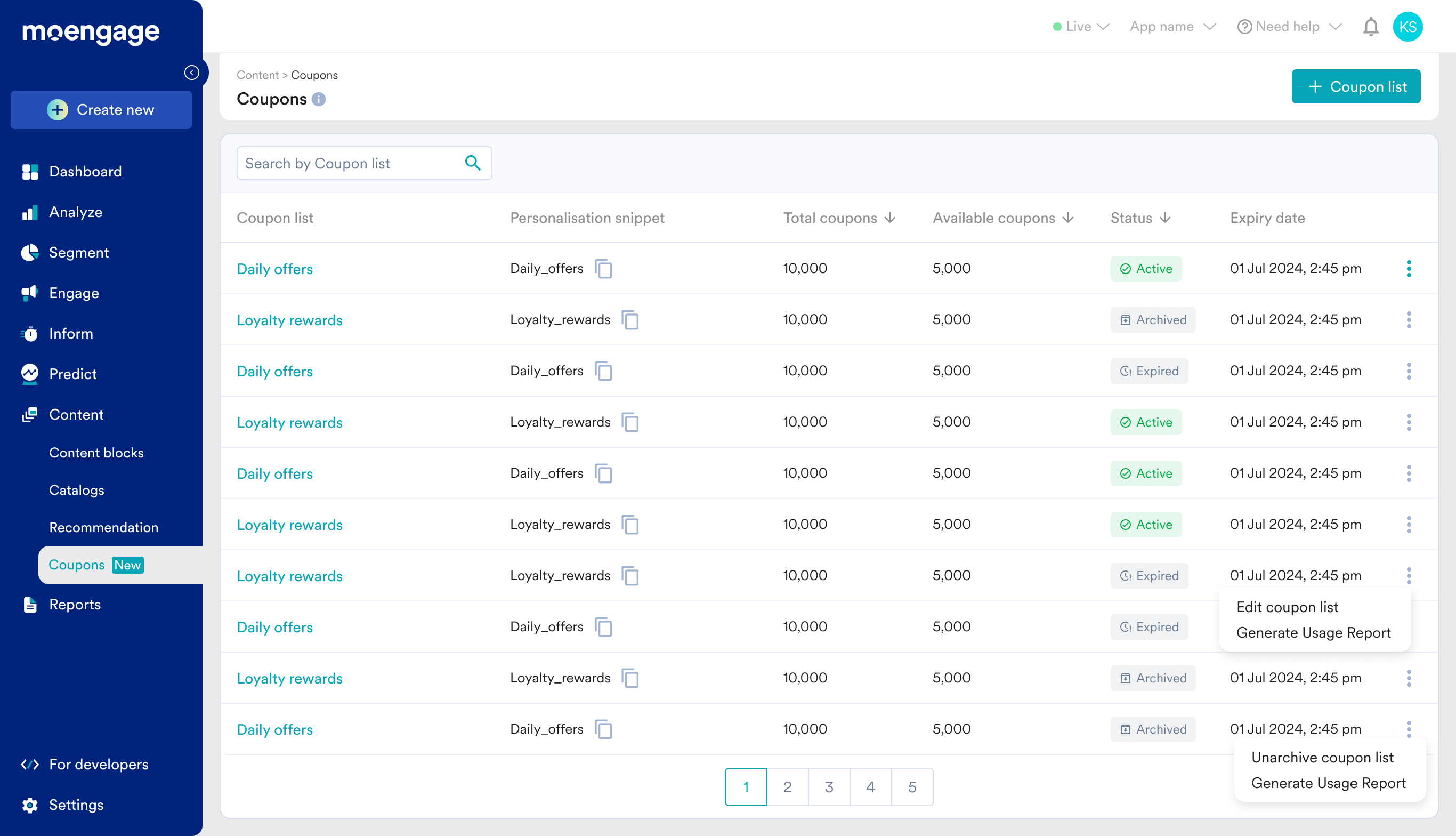リストがアーカイブされると、すべての利用可能なクーポンがMoEngageシステムから削除されます。その結果、このクーポンリストを参照するキャンペーンは、コードを取得することができません。