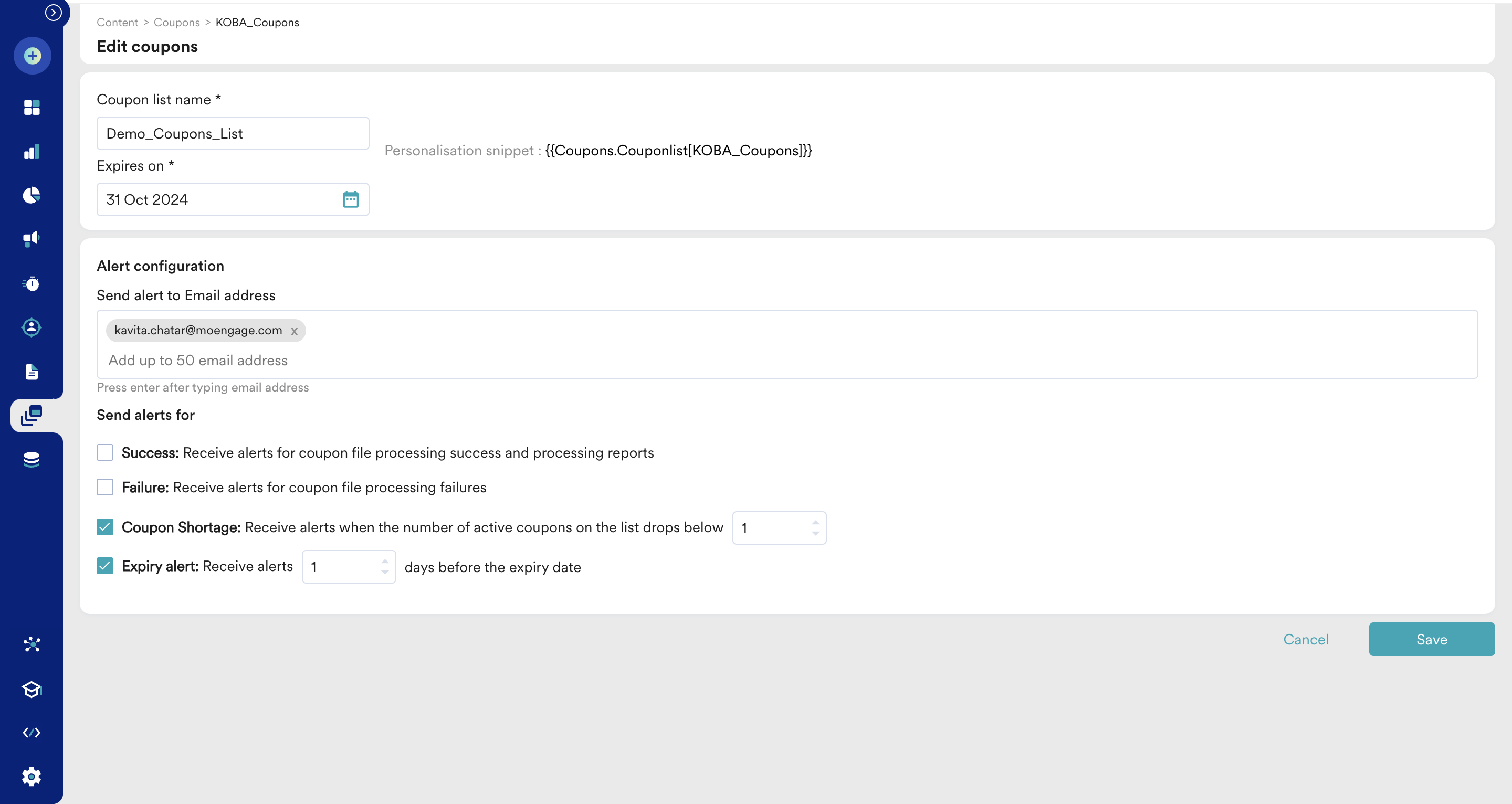 - クーポン不足アラート: このアラートは、クーポンリストが設定した閾値を下回った場合に通知し、より多くのクーポンを追加するリマインダーとして機能します。