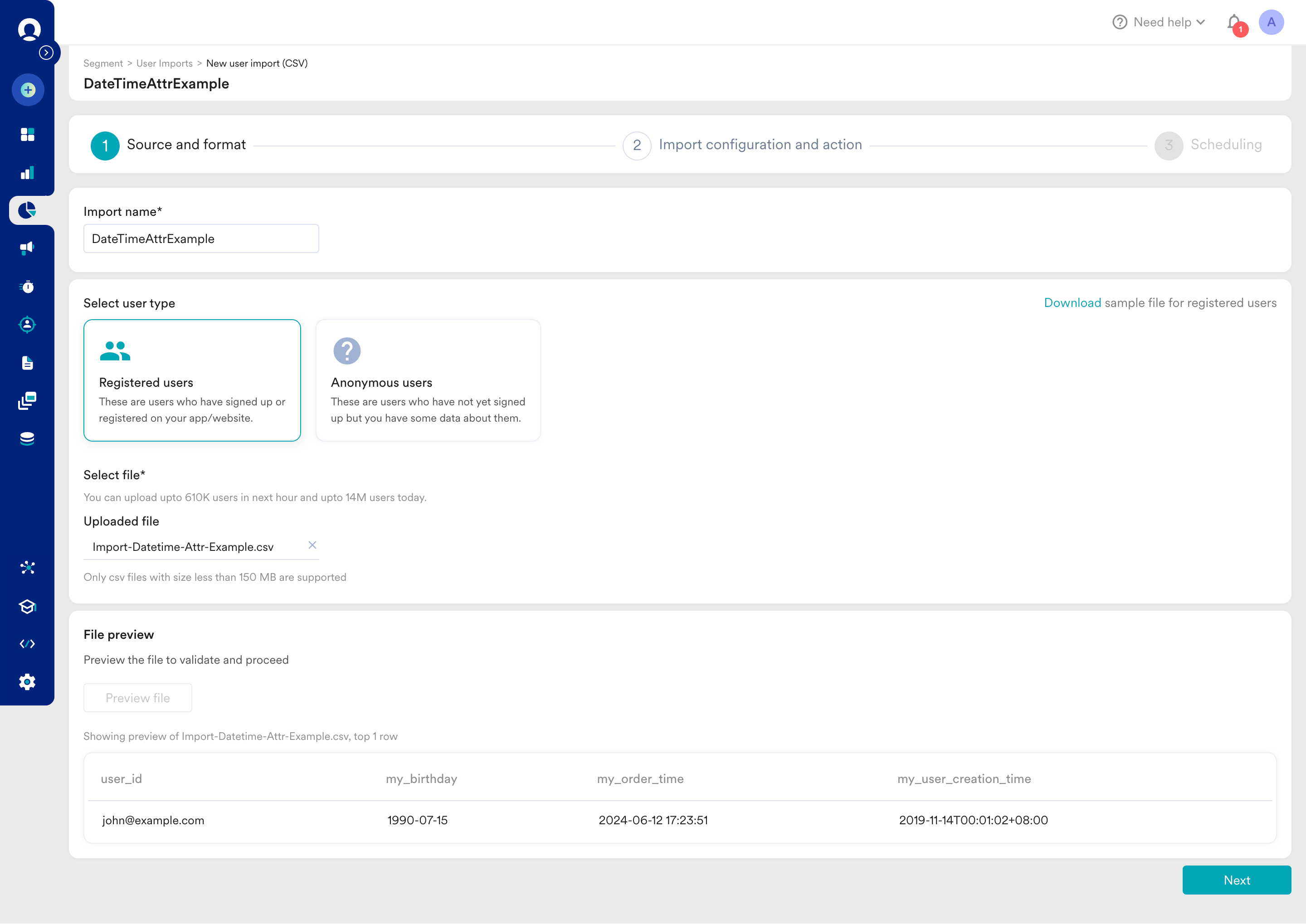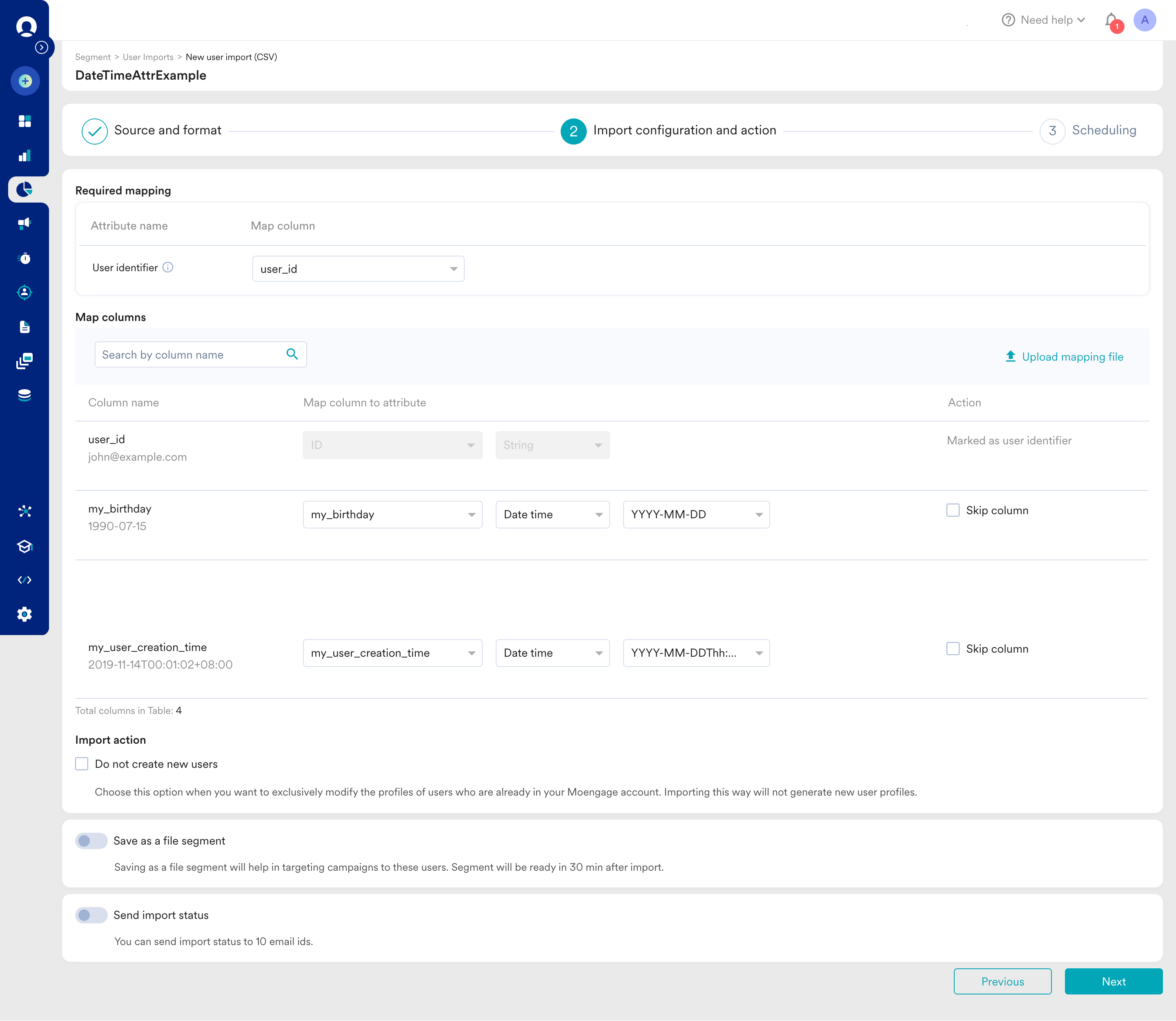 あなたの属性が正しくdatetimeとしてインポートされるためには、これらの属性の許可されたdatetimeタイプをMoEngageに通知する必要があります。サンプル .csv ファイルを作成することから始めて、以下の列を含めます: