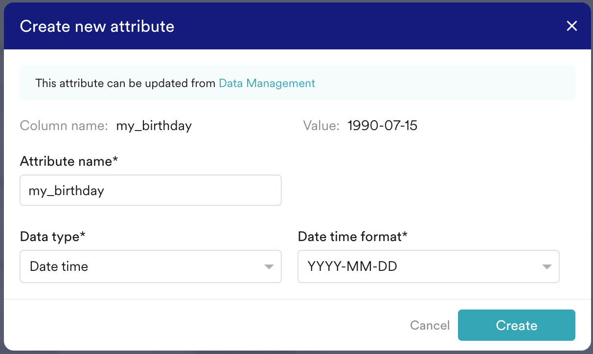 - 各属性に対して datetime を選択することを確認してください。ユーザー属性とイベント属性の両方についてこれを実行する必要があります。
