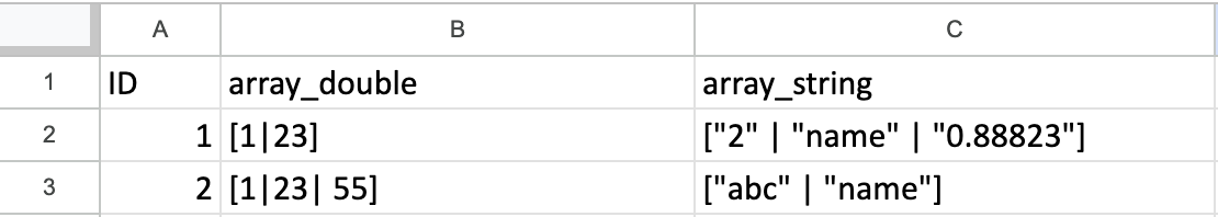 All the elements in the array have to be homogenous, which means they must be either integers or strings. If they are not homogenous, MoEngage tries to typecast (transform) the element and then store the data. Following is the example of an array in a CSV field: [1|2|3]