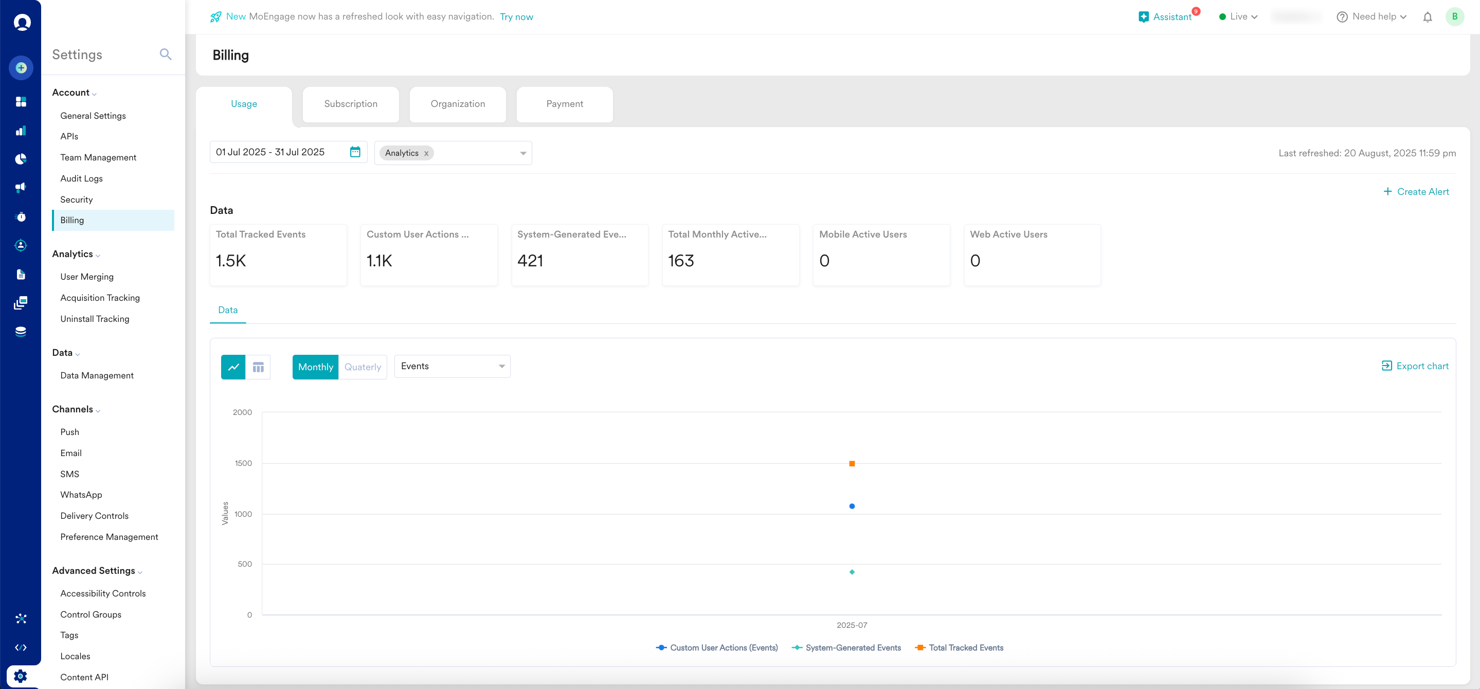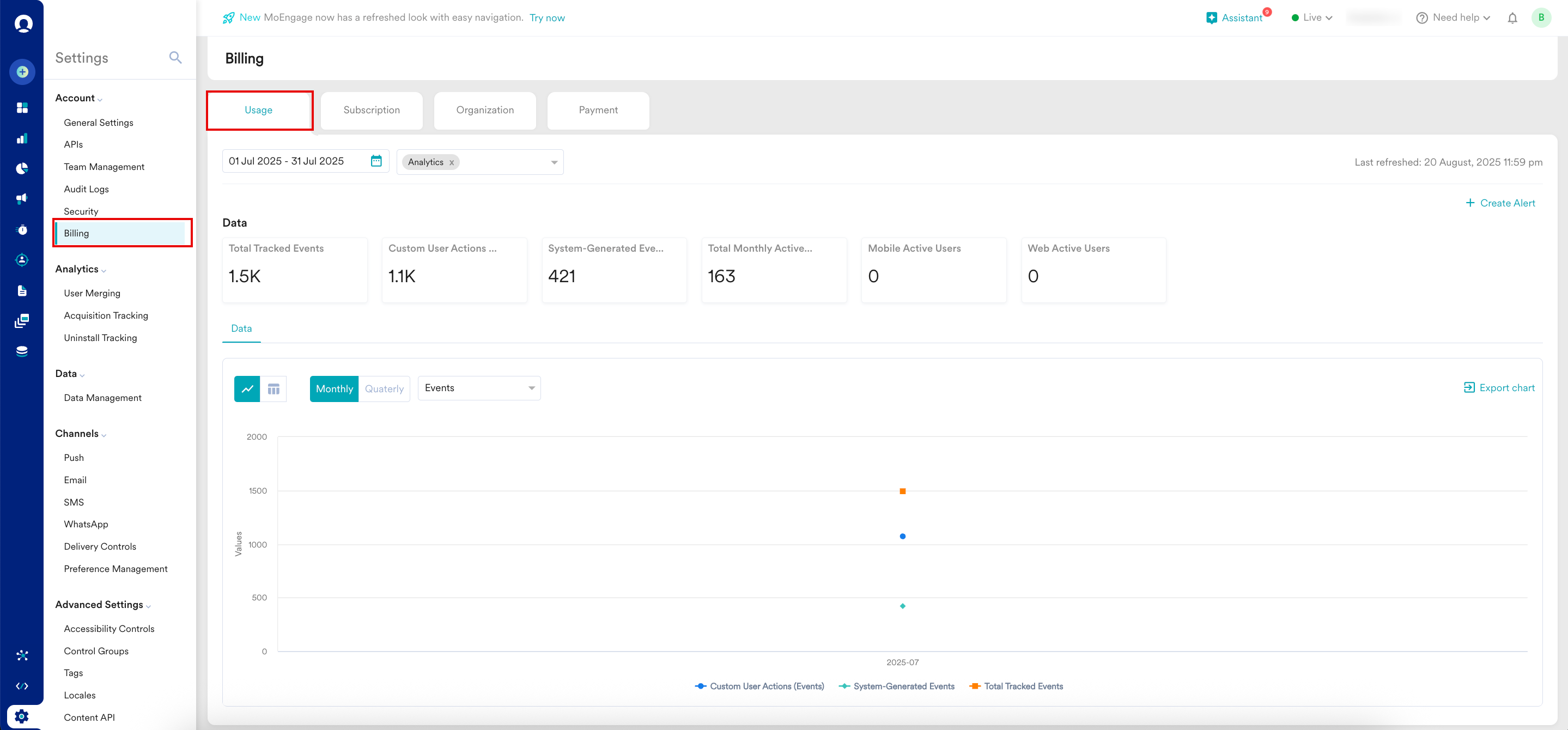 - MoEngageダッシュボードの左側のナビゲーションメニューで、 設定 > アカウント > 請求 をクリックします。