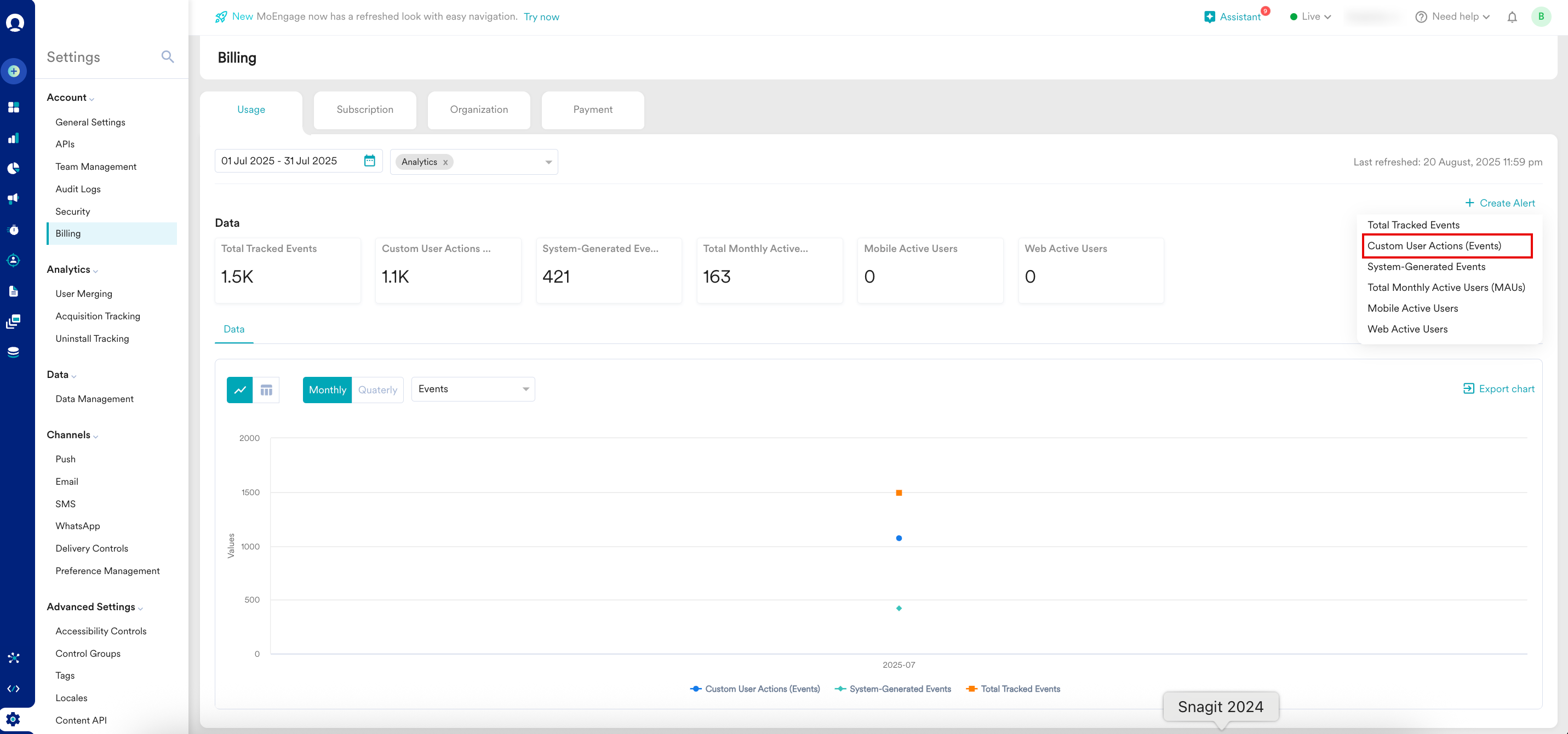 この 使用状況 ページでは、カスタムユーザーアクション(イベント)、システム生成イベント、月間アクティブユーザー(MAU)、請求可能な月間追跡ユーザー(MTU)など、さまざまな請求指標にわたる月間使用状況を理解し、追跡するのに役立ちます。これにより、使用パターンを管理し、請求の透明性を構築できます。