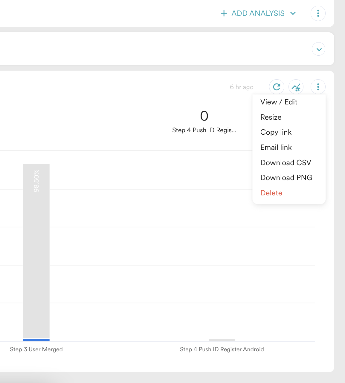 分析レポートを編集するには、チャートエリアをクリックするか、3点メニュー内の「表示 / 編集」ボタンをクリックしてください。編集分析機能は、それぞれの行動、ファネル、リテンション、またはセッションおよびソースページを開き、すべての分析パラメータを事前に読み込みます。
