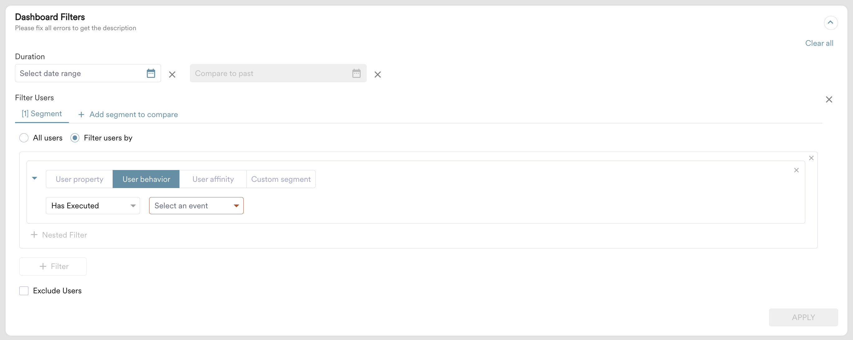 ダッシュボードフィルターは、ダッシュボード内のすべてのチャートおよびテーブルに希望するフィルターを適用する強力な機能です。 ダッシュボードフィルター の見出しをクリックし、希望する日付範囲を選択し、希望するカスタムセグメントをフィルタリングするか、セグメントを作成してから、 APPLY をクリックします。選択したフィルターは、ダッシュボード内のすべてのチャートに適用されます。