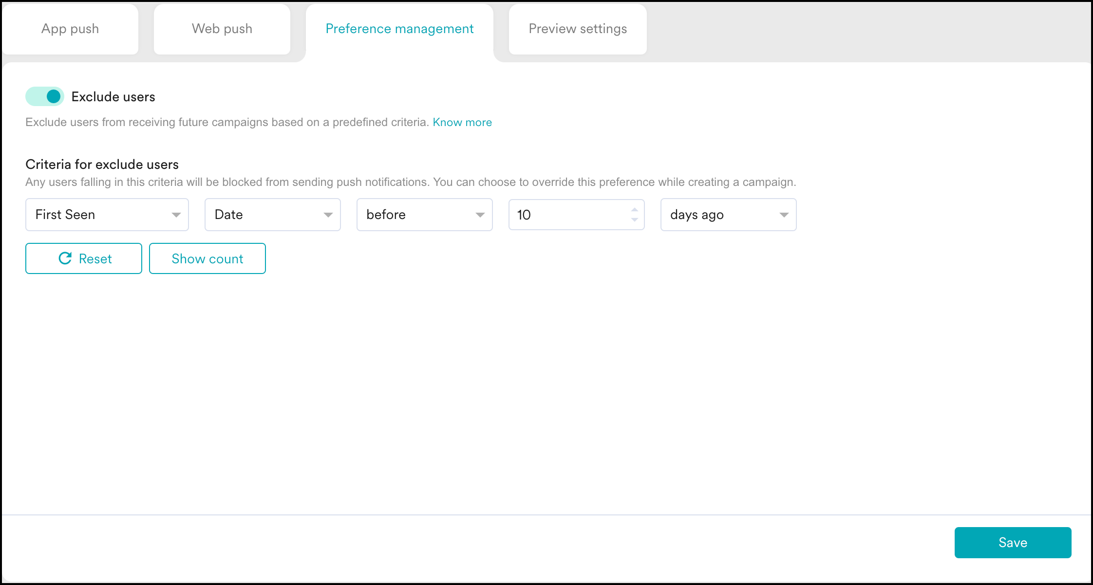 - Add a filter for the users you want to exclude in the Criteria for excluded users section. You can see the count of these users by clicking on Show Count .