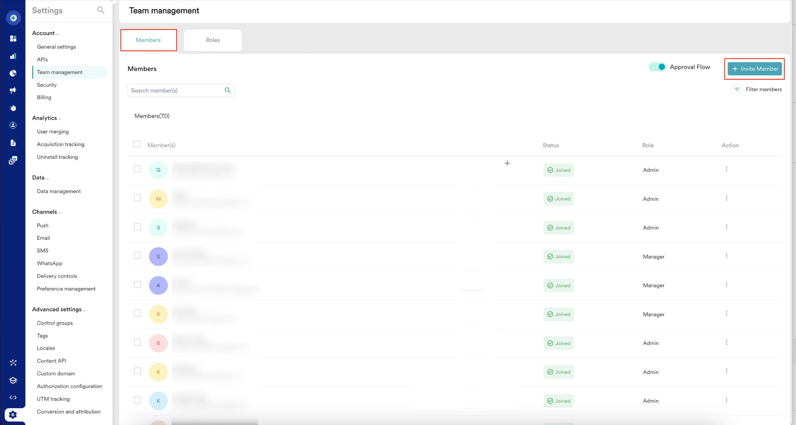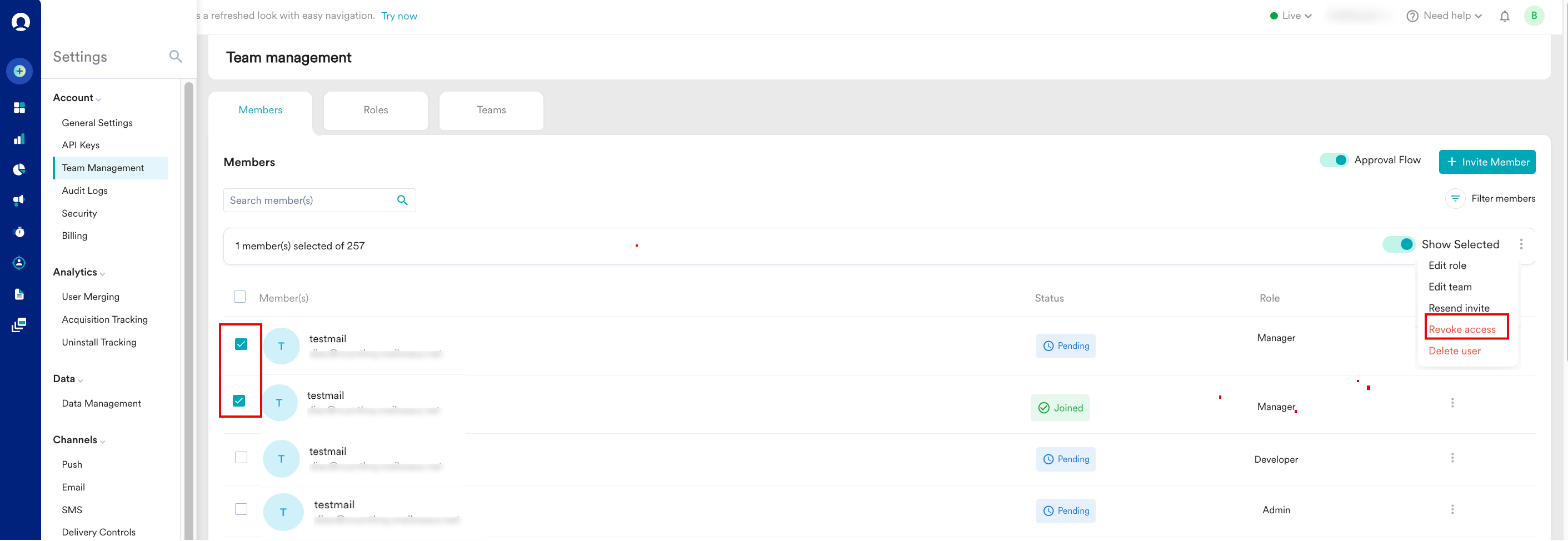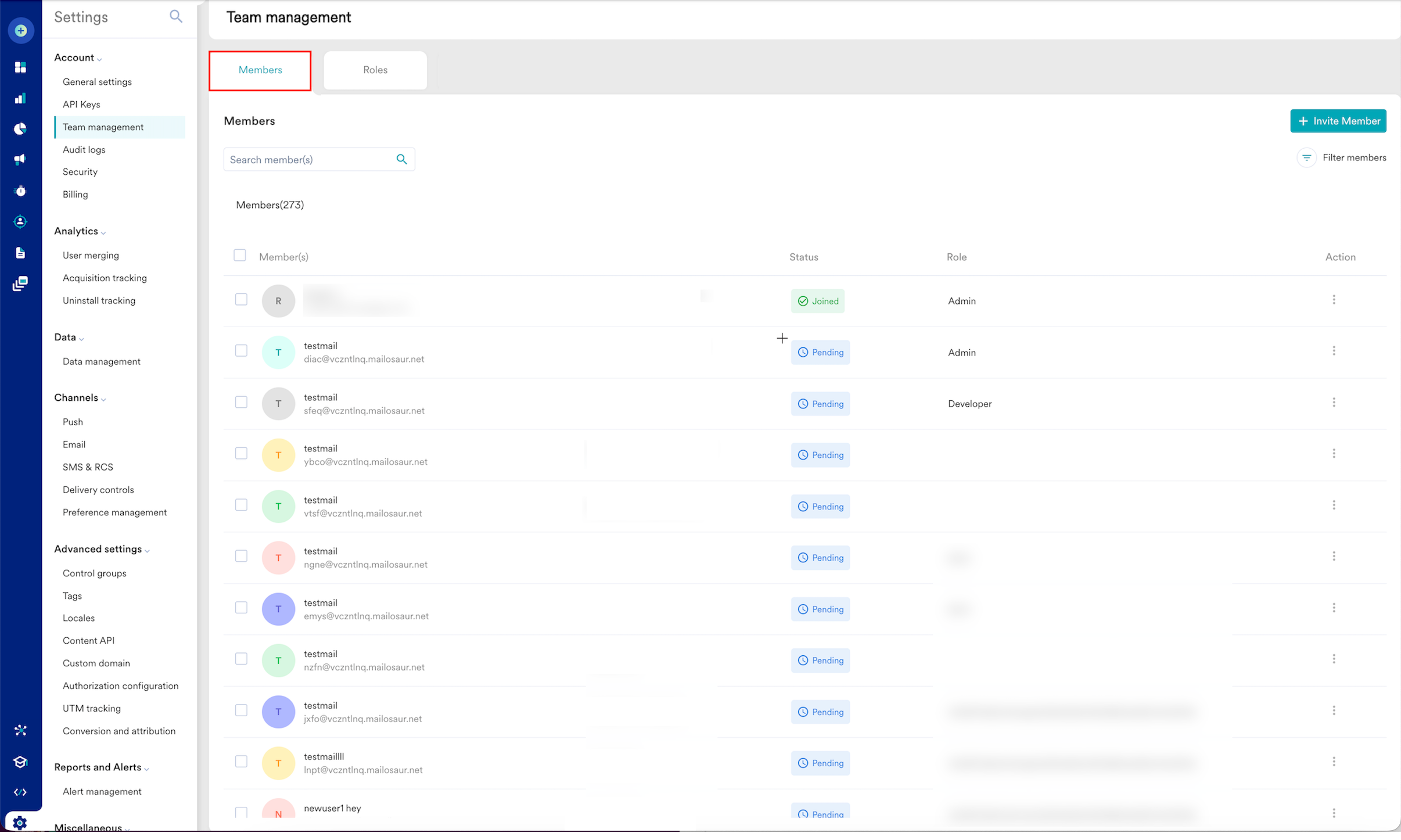 - MoEngage ダッシュボードの左側のナビゲーションメニューで、 設定 > アカウント > チーム管理 > メンバー をクリックします。