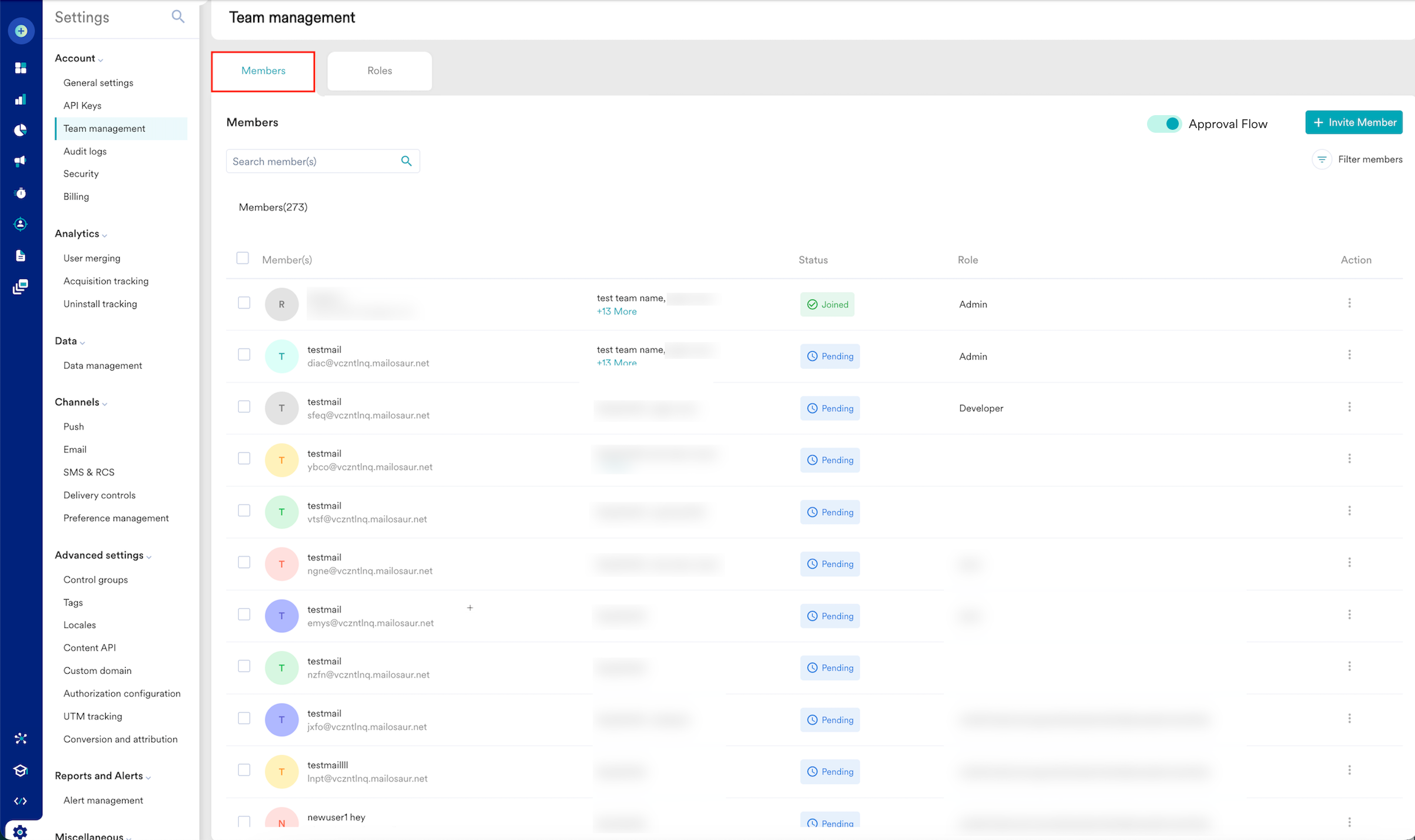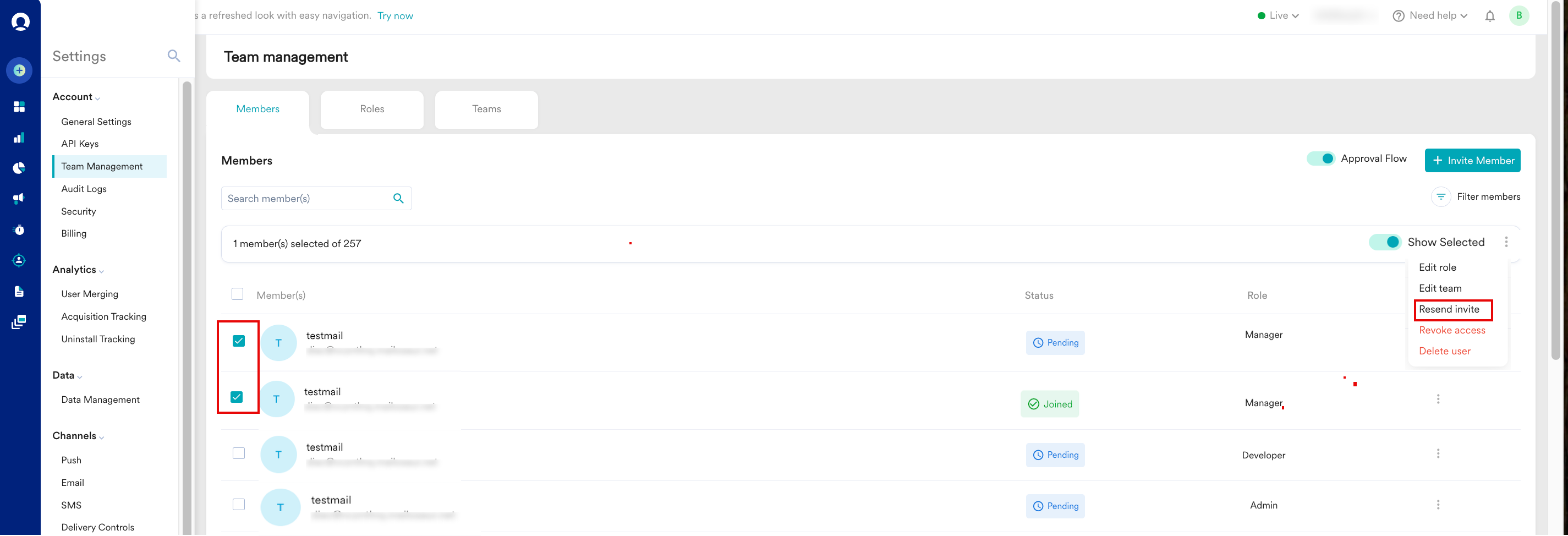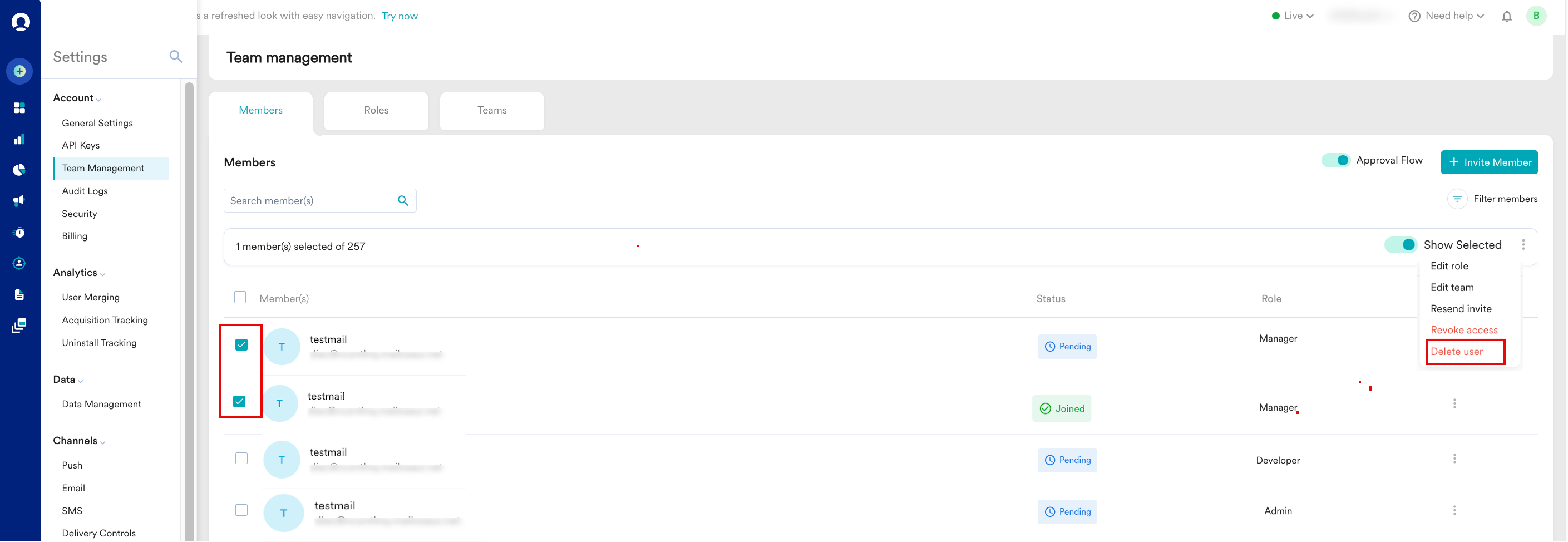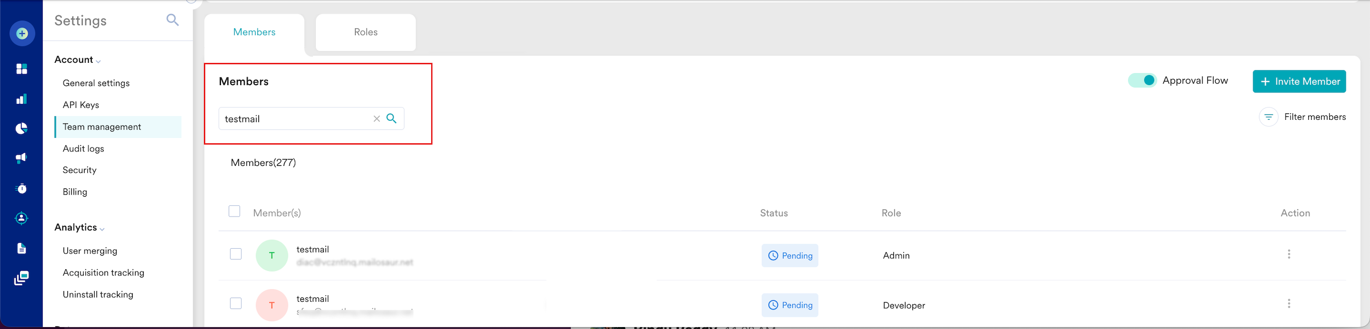 - MoEngage ダッシュボードの左側のナビゲーションメニューで、 設定 > アカウント > チーム管理 > メンバー をクリックします。