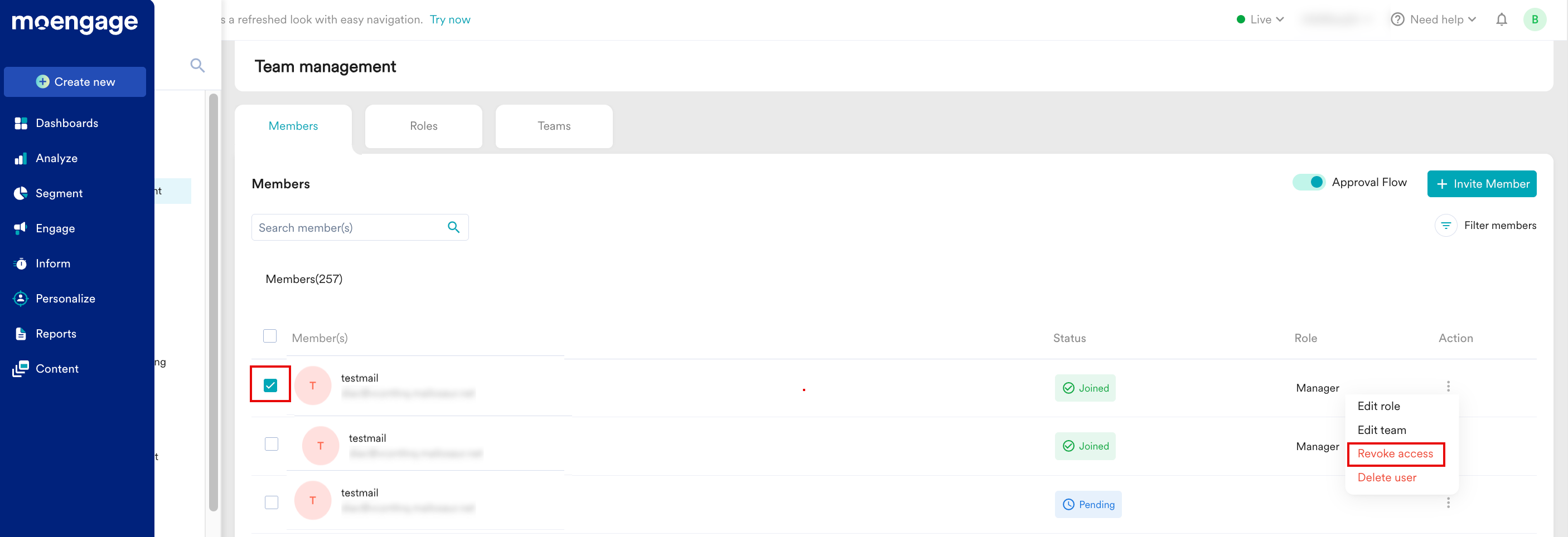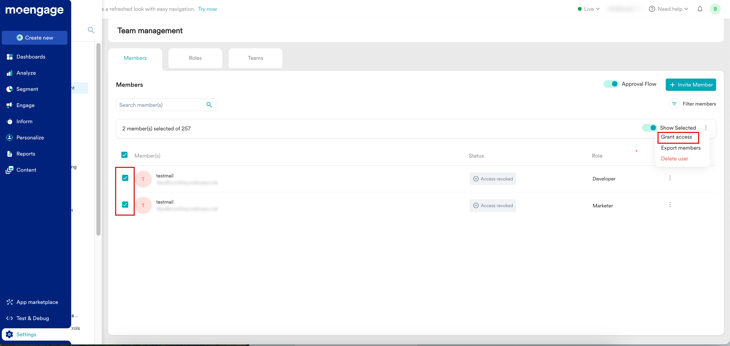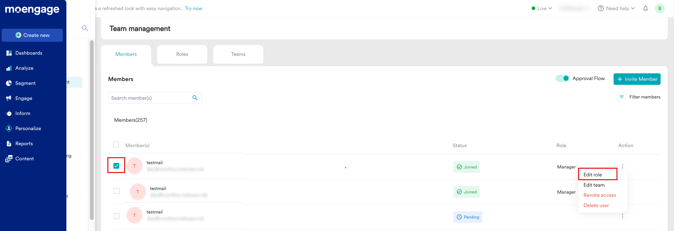 - パスワードをリセットした後、アカウントにログインし、ワークスペース内の既存のユーザーに管理者アクセスを割り当てるか、新しいユーザーを管理者アクセスで招待してください。この新しい管理者は、そのプロジェクトのMoEngageダッシュボードにアクセスできるようになります。