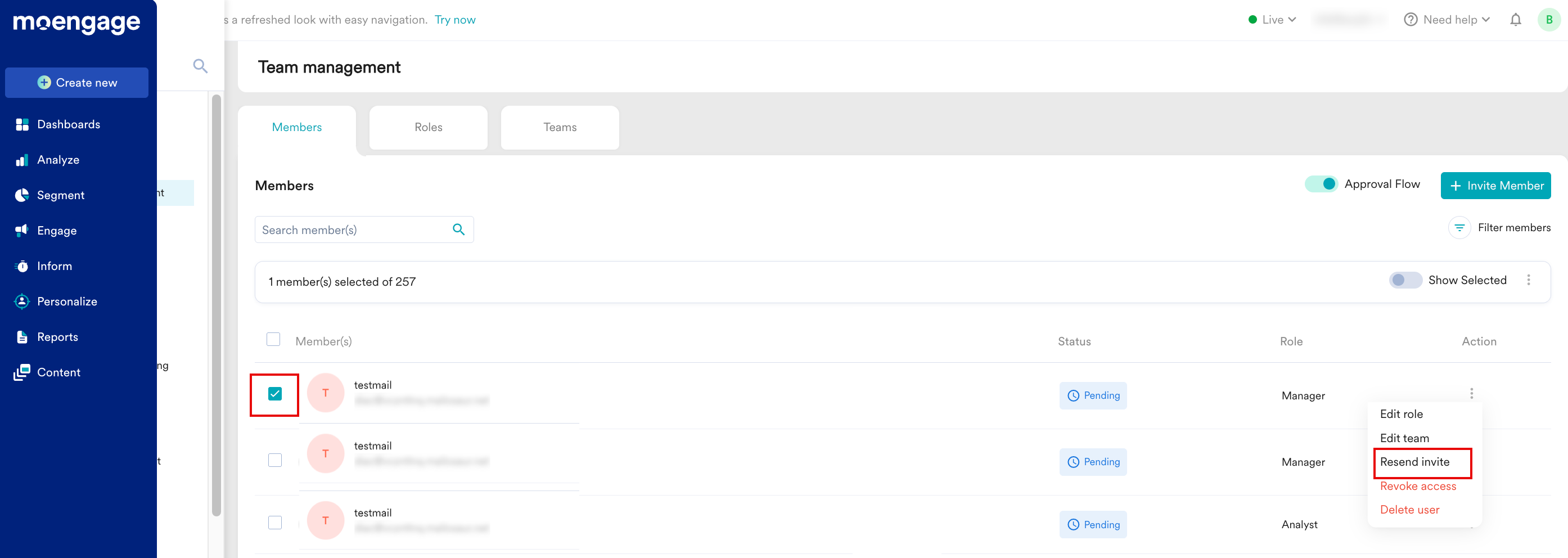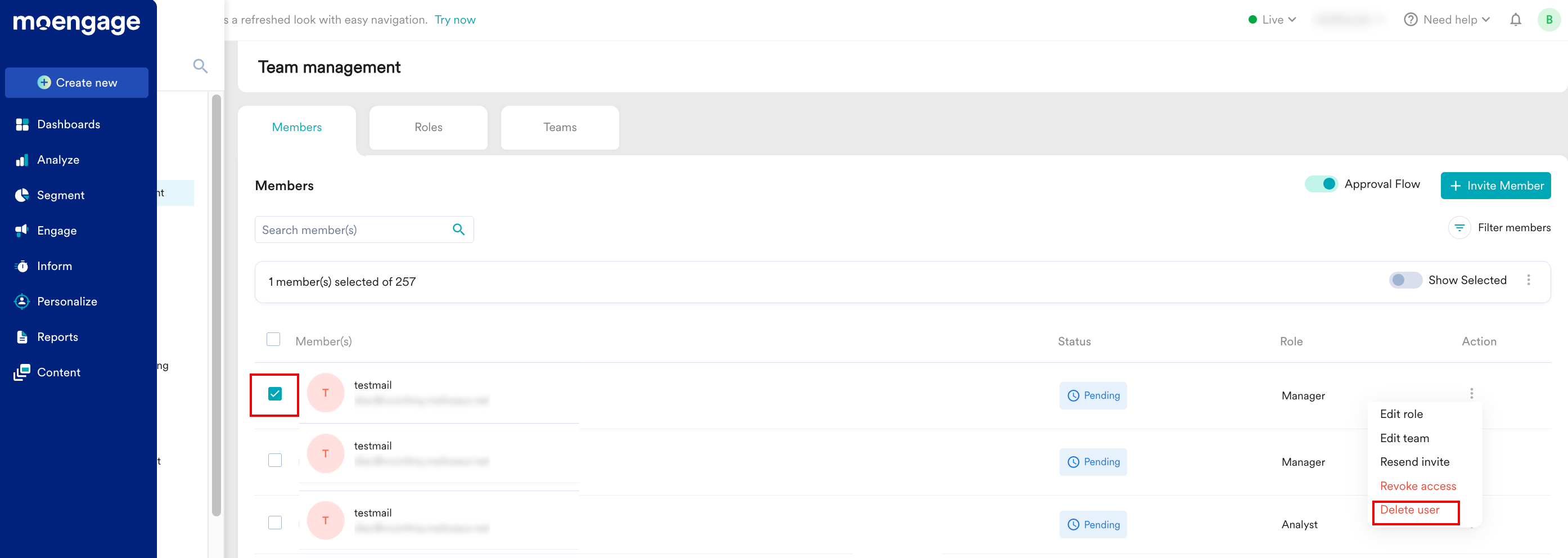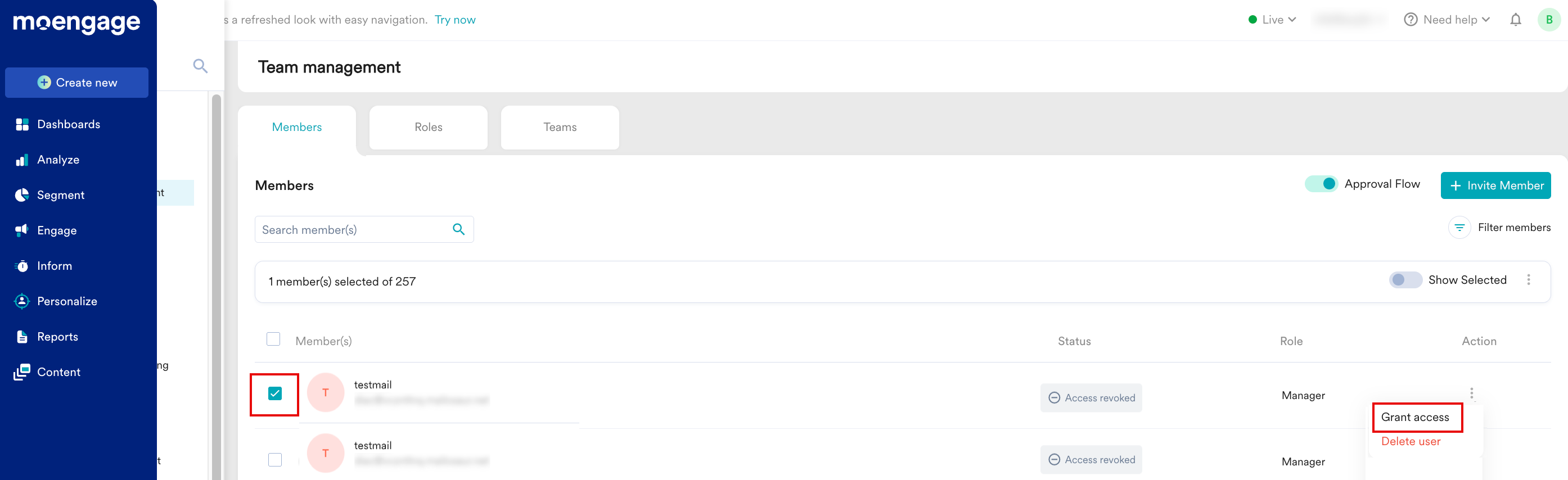 - パスワードをリセットした後、アカウントにログインし、ワークスペース内の既存のユーザーに管理者アクセスを割り当てるか、新しいユーザーを管理者アクセスで招待してください。この新しい管理者は、そのプロジェクトのMoEngageダッシュボードにアクセスできるようになります。