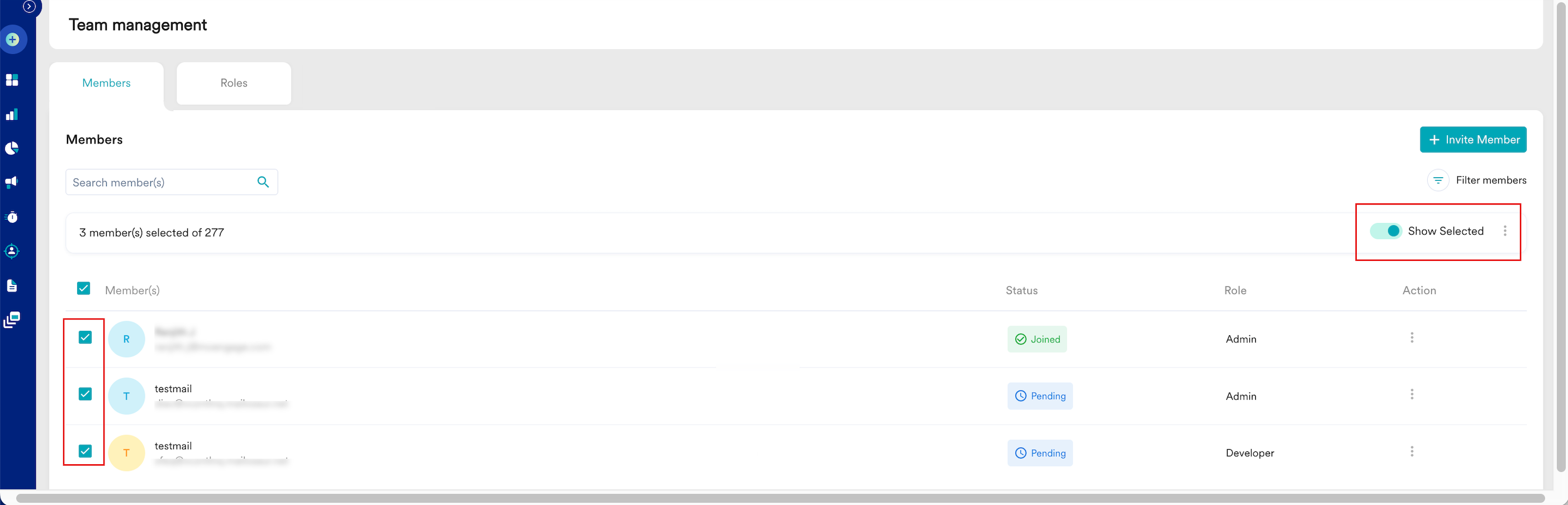 - 選択したメンバーのリストを表示するには、 選択したものを表示 トグルをオンにしてください。